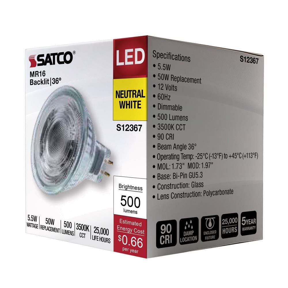 SATCO MR16 lamps are available with GU5.3 and GU10 bases, for versatile lighting solutions in 12V and 120V applications. These lamps are offered in a wide range of color temperatures, from a warm 2700K, to a bright 6500K, and provide high color accuracy with a 90 CRI rating. Dimmable for customizable lighting, they are also damp location rated, and suitable for use in enclosed fixtures. Perfect for a variety of residential and commercial applications, SATCO MR16 lamps combine efficiency, durability, and high-quality lighting.