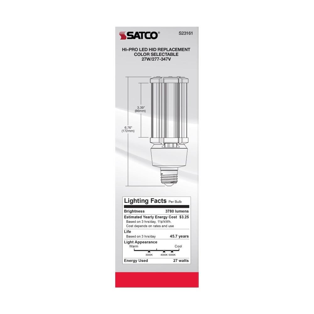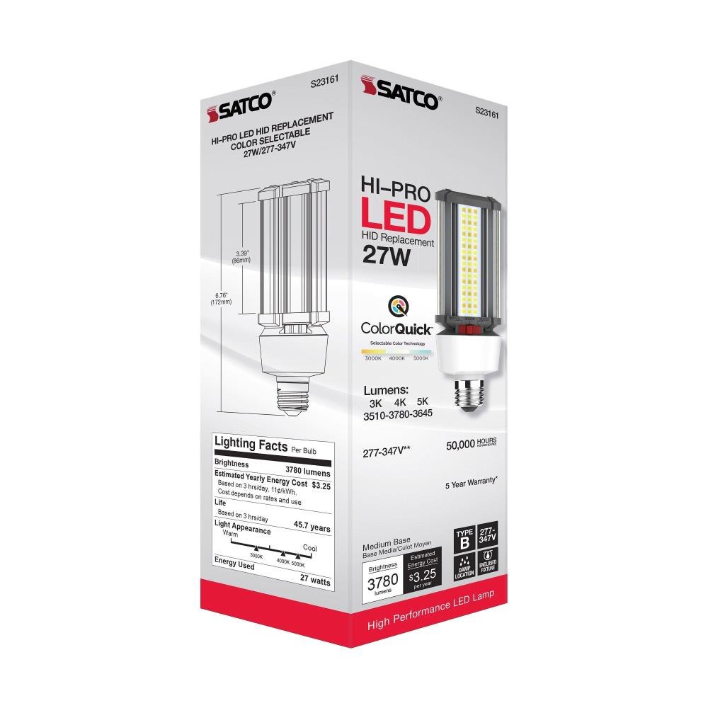 Satco's S23161 27 watt corncob lamp is the lamp of choice for large scale applications. Illuminate gymnasiums, warehouses, or any venue with high ceilings requiring superior light output. This CCT selectable lamp delivers 50,000 hours of clean, energy saving light.