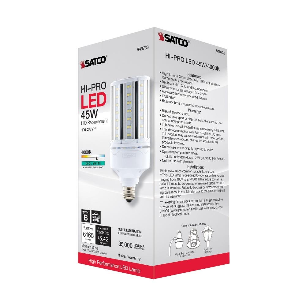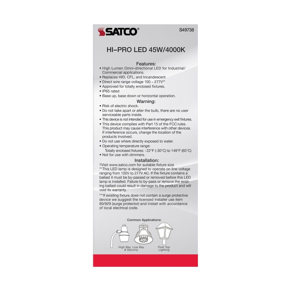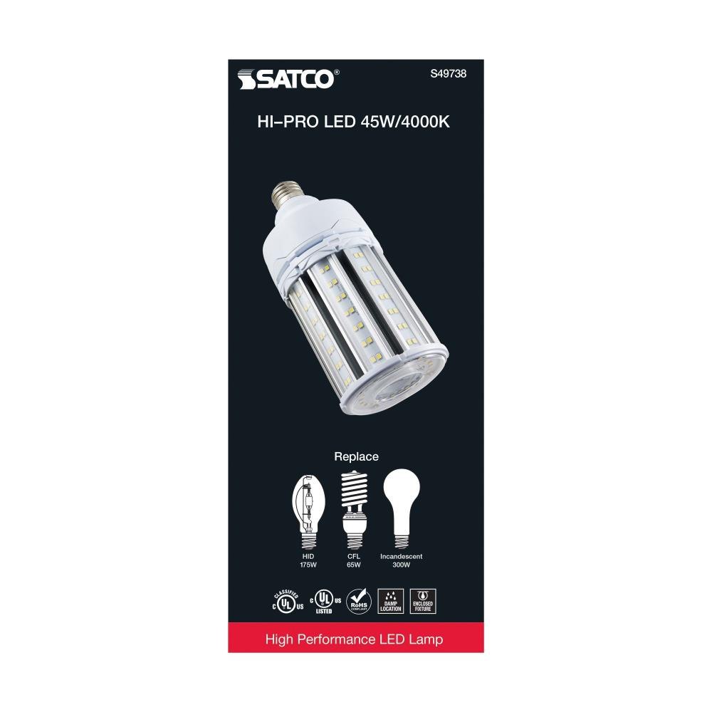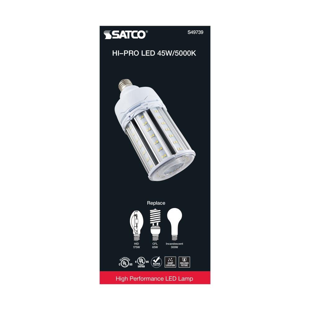 This generation of our popular Hi-Pro commercial LED lamps delivers up to 80 percent of energy savings, superior LED lighting, and the best value in the industry. The high lumen capability built into each lamp, with many wattages to choose from, means more solutions for more venues. The 300-degree beam spread delivers clean, efficient LED lighting from higher fixtures. The lamp is perfect for gymnasiums, factory floors, health clubs, warehouses, and any venue where high ceilings require high lumen, low maintenance, and energy-efficient light output.High lumen per watt ratioSuperior LED light outputRated for use in enclosed fixturesAdvanced thermal managementSuitable for use in damp locationsUp to 35000 Hours of use3kV built-in surge protection.