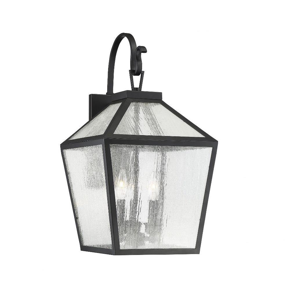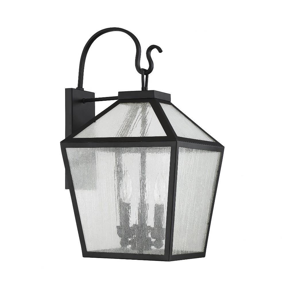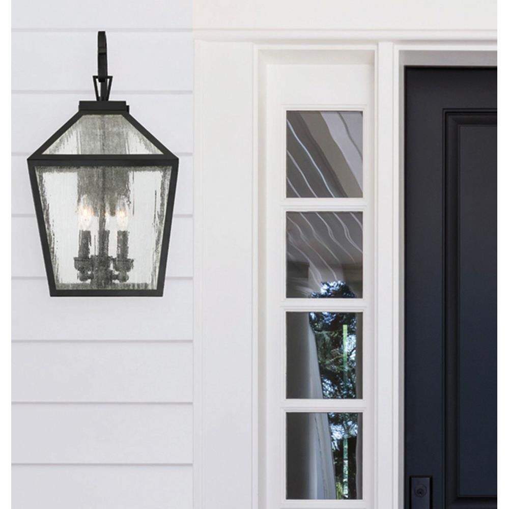 The 5-101-BK outdoor wall lantern from the Woodstock collection merges vintage lantern charm with a modern farmhouse aesthetic, creating a captivating fixture for exterior spaces. Standing 23.5 inches tall and 12 inches wide, its geometric greenhouse-style frame features a matte black finish that complements diverse architectural styles and color schemes. Clear seeded glass panes enhance texture and provide maximum illumination, contributing to both safety and visual appeal.