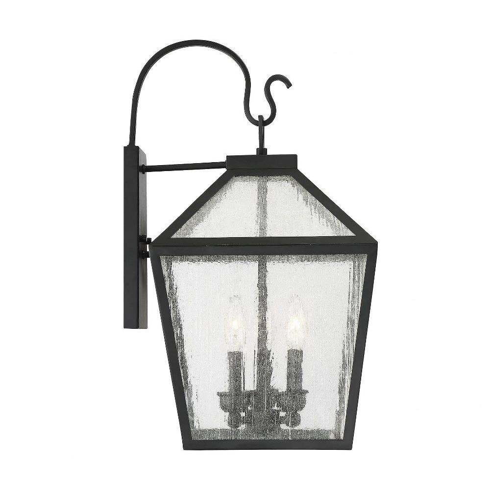 - Outdoor wall lantern fixture with glass panes and metal frame