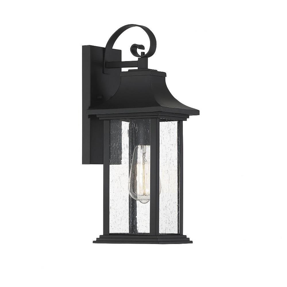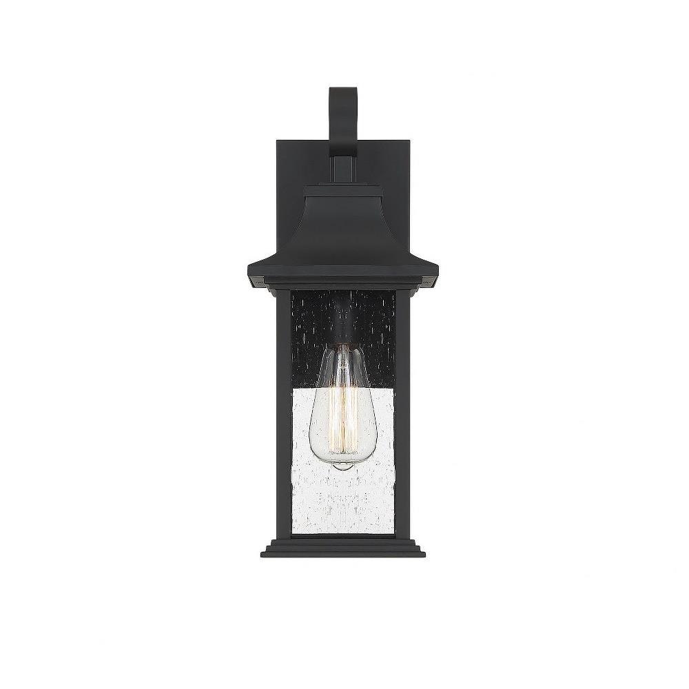 The Savoy House Hancock 1-Light Outdoor Wall Sconce (Model 5-450-BK) combines traditional design with farmhouse and rustic inspirations to create an elegant exterior lighting solution. Measuring 17.25 inches in height and 6.75 inches in width, this outdoor wall lantern is crafted from durable metal and clear seeded glass, providing both longevity and visual appeal. Its black finish enhances versatility, allowing seamless integration with various architectural styles.