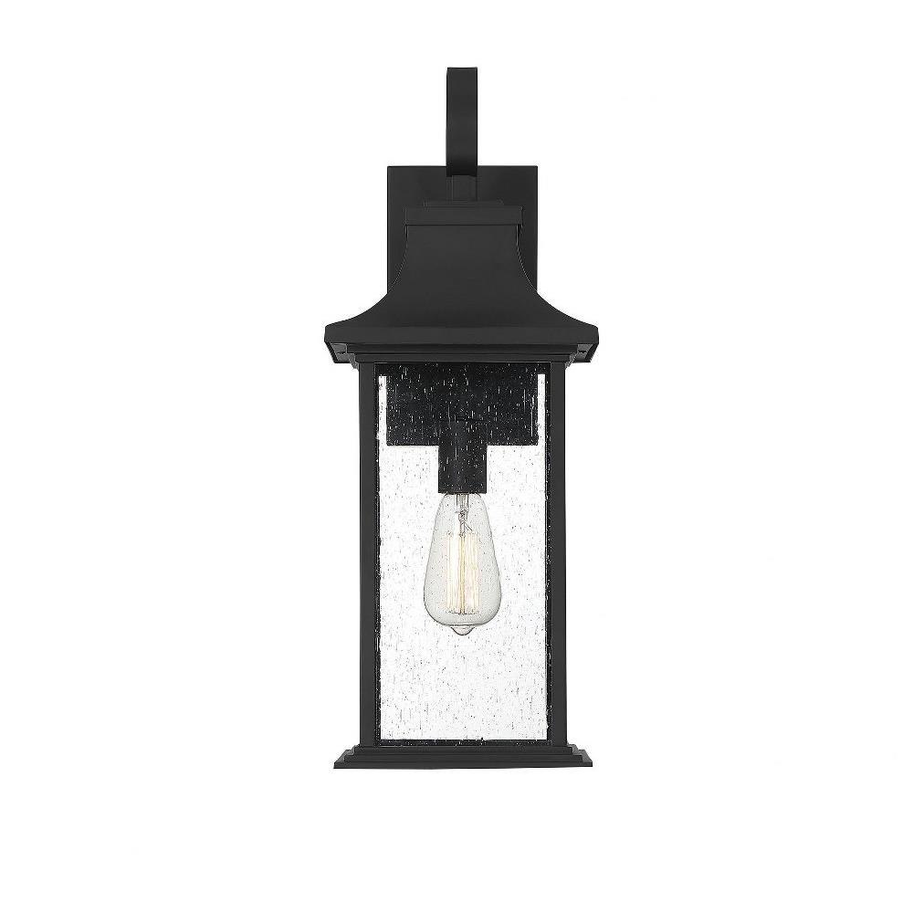 The Savoy House Hancock 1-Light Outdoor Wall Sconce offers a sophisticated blend of traditional design with rustic and farmhouse inspirations, ideal for enhancing the exterior ambiance of residential spaces. Measuring 22.75 inches in height and 8.5 inches in width, this outdoor wall lantern features a boldly sloped roof and shepherd’s hook detailing that accentuate its classic aesthetic. The clear seeded glass panes provide a distinctive, dramatic glow, contributing to both style and functionality.