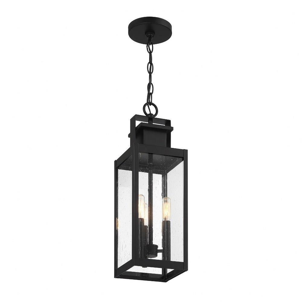 The Savoy House Ascott 3-light outdoor hanging lantern delivers a sleek, contemporary aesthetic ideal for exterior spaces requiring both style and functionality. Standing 20 inches tall with a 6.5-inch width and length, this lantern features a sharply angled frame finished in matte black, complementing modern architectural elements. Its slender profile and clear seeded glass panes allow the light to disperse evenly, creating an inviting ambiance at entryways, patios, or porches.
