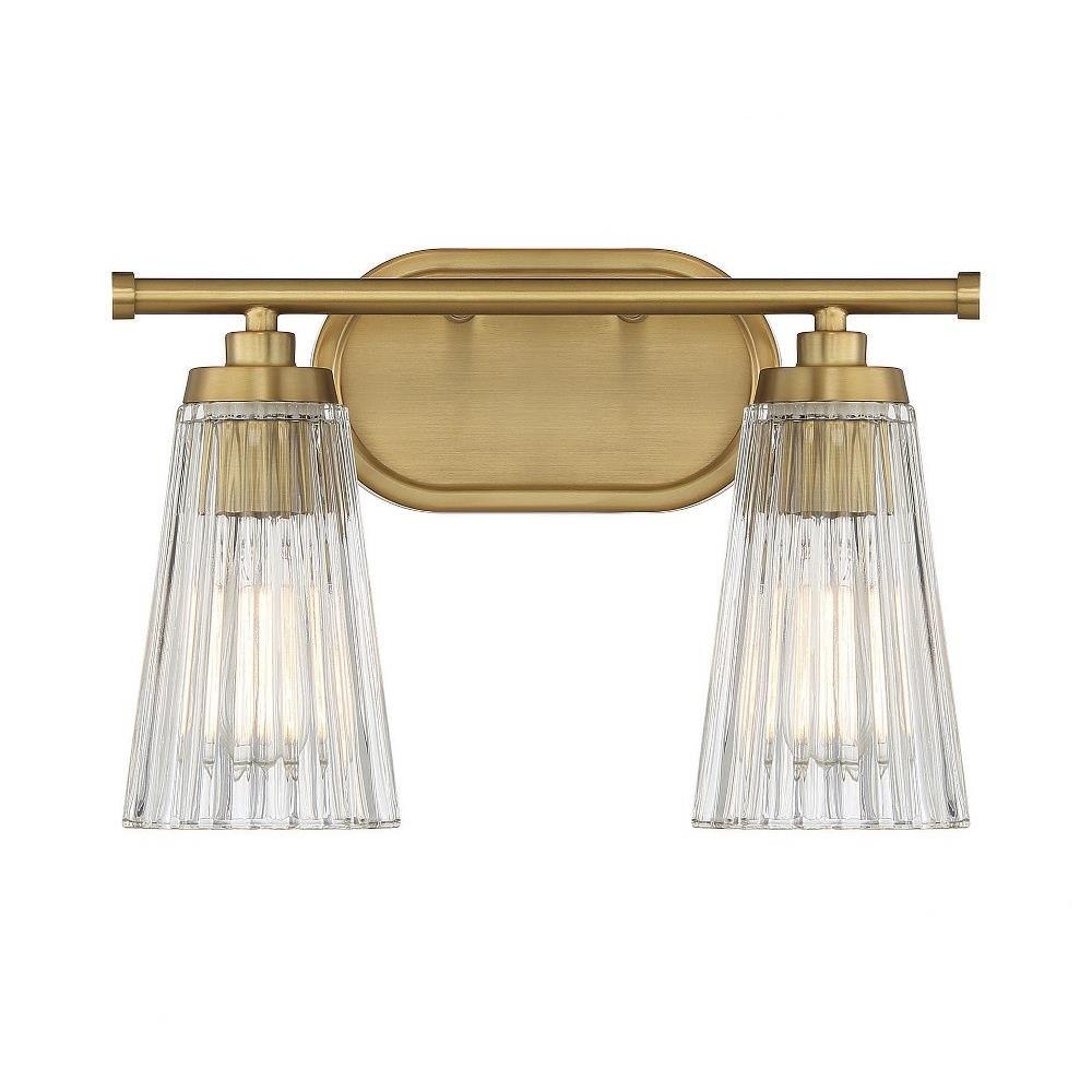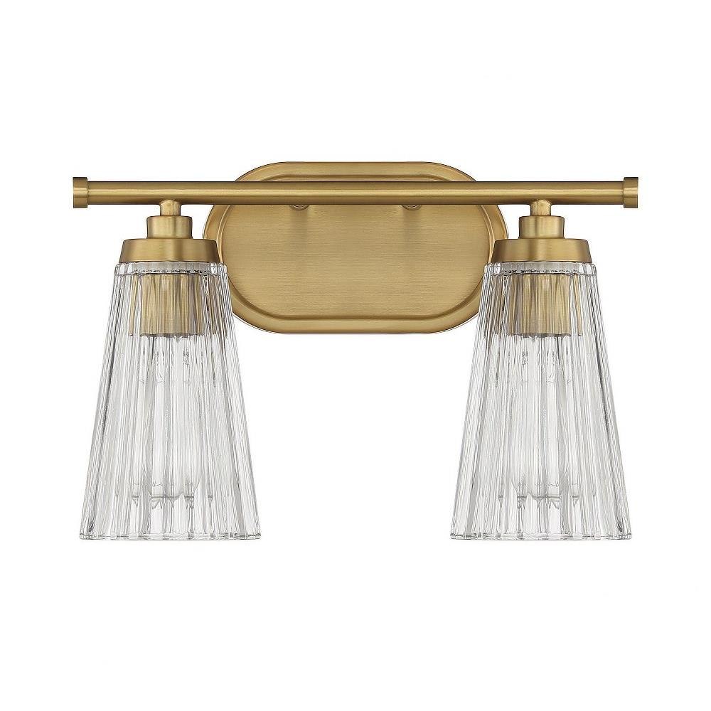 The Chantilly 2-Light Bath Vanity delivers a vintage-inspired aesthetic, featuring textured clear ribbed glass shades that serve as a focal point. This fixture measures 10 inches in height, 14 inches in width, and extends 7 inches from the wall, making it an ideal size for bathroom or powder room installations.