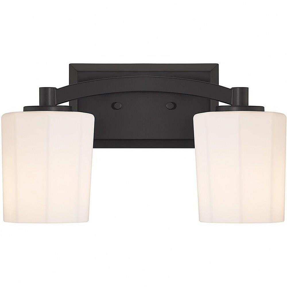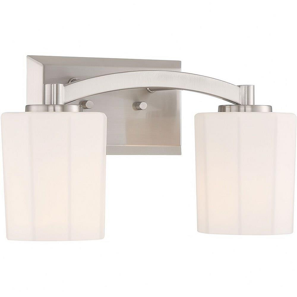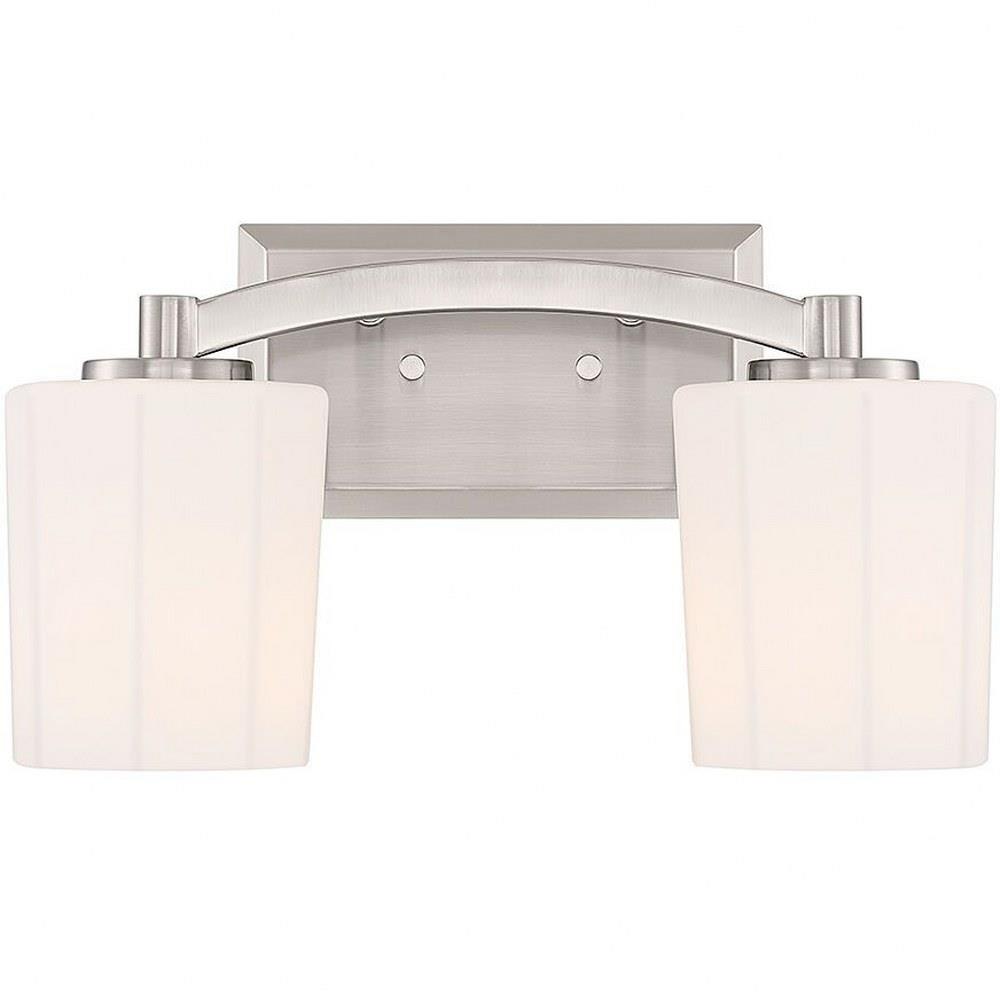 Constructed from durable metal and glass materials, this bath vanity light features two opal etched glass fluted shades that diffuse light softly, providing a flattering glow ideal for bathroom settings. It supports two standard incandescent bulbs, each up to 60 watts (bulbs not included), and includes dimmable functionality to customize illumination levels. The fixture is part of the Whitney collection and belongs to the wall lights family, designed specifically as a vanity light.