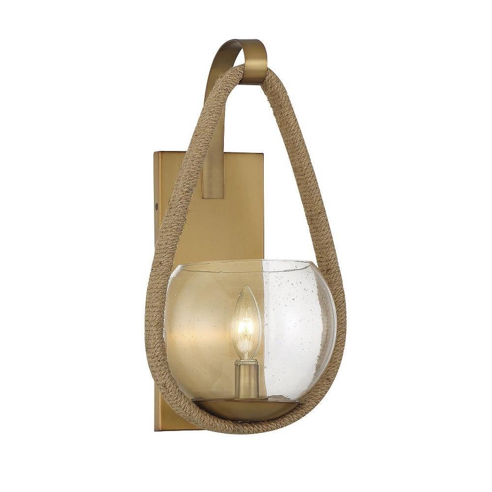 The Ashe 1-Light Wall Sconce by Savoy House presents a distinctive Bohemian and Contemporary design, perfectly suited for a variety of interior spaces. Measuring 16 inches in height and 8.5 inches in width, this wall sconce extends 8.5 inches from the wall, offering a balanced profile that complements both compact and expansive rooms. The fixture's warm brass finish enhances its organic aesthetic, while the textured rope band encircling the clear seeded glass shade adds tactile dimension and visual interest, maintaining style even when the light is off.