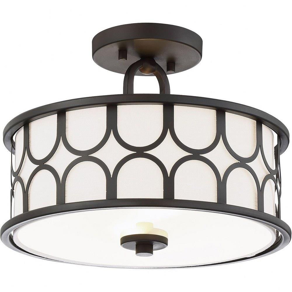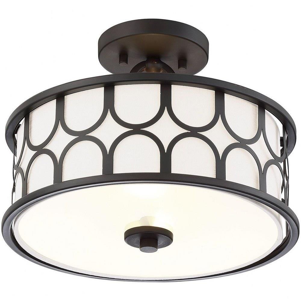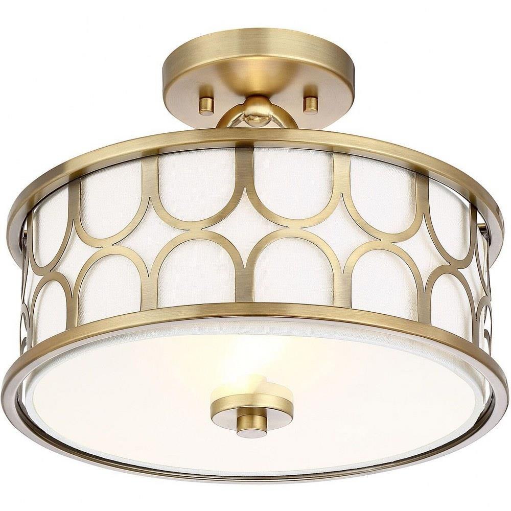 This 2-light ceiling semi-flush mount will add lots of style and useful light to any room! It flaunts a geometric pattern with mid-century inspiration and a crisp white fabric shade. Natural Brass finish.