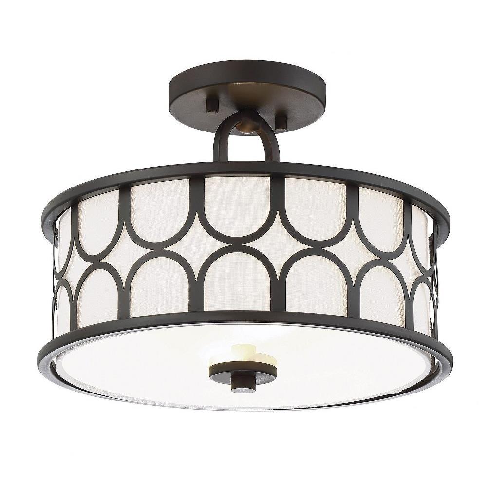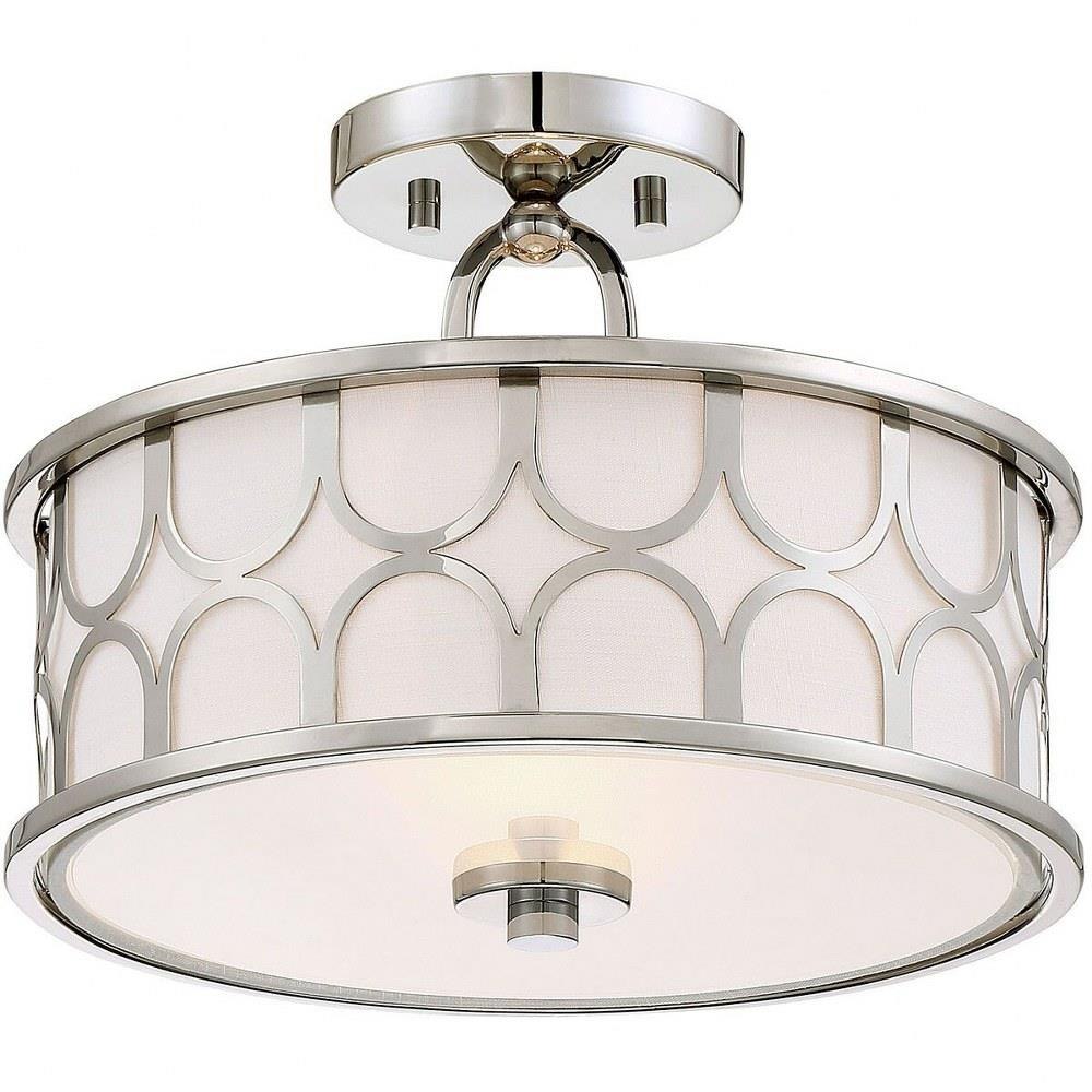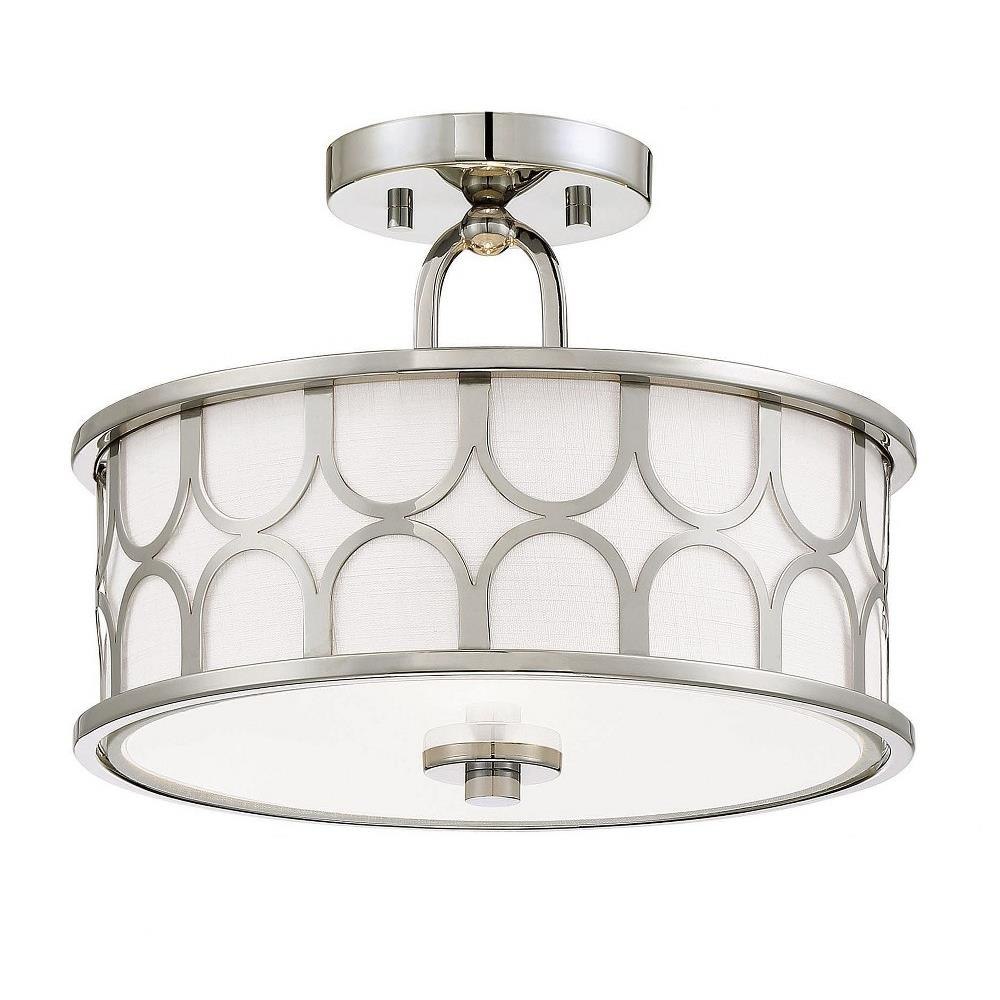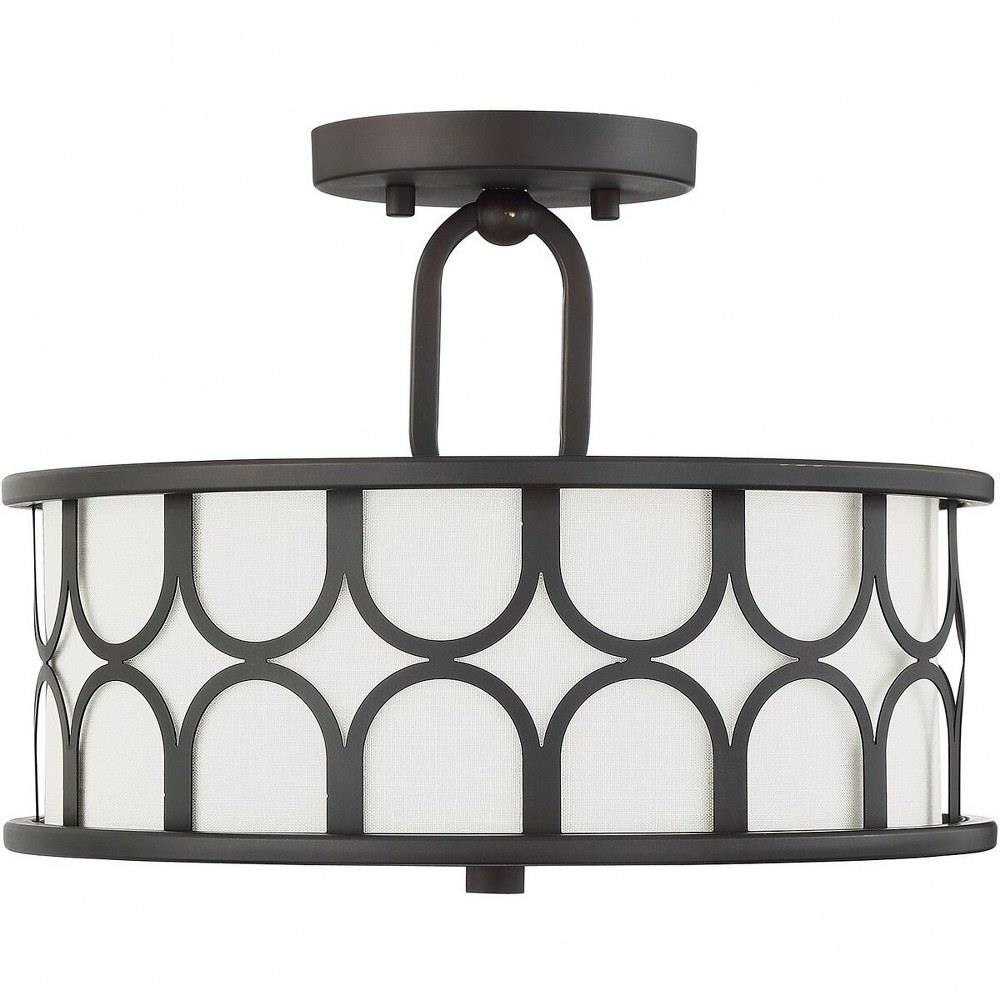 This 2-light ceiling semi-flush mount will add lots of style and useful light to any room! It flaunts a geometric pattern with mid-century inspiration and a crisp white fabric shade. Natural Brass finish.