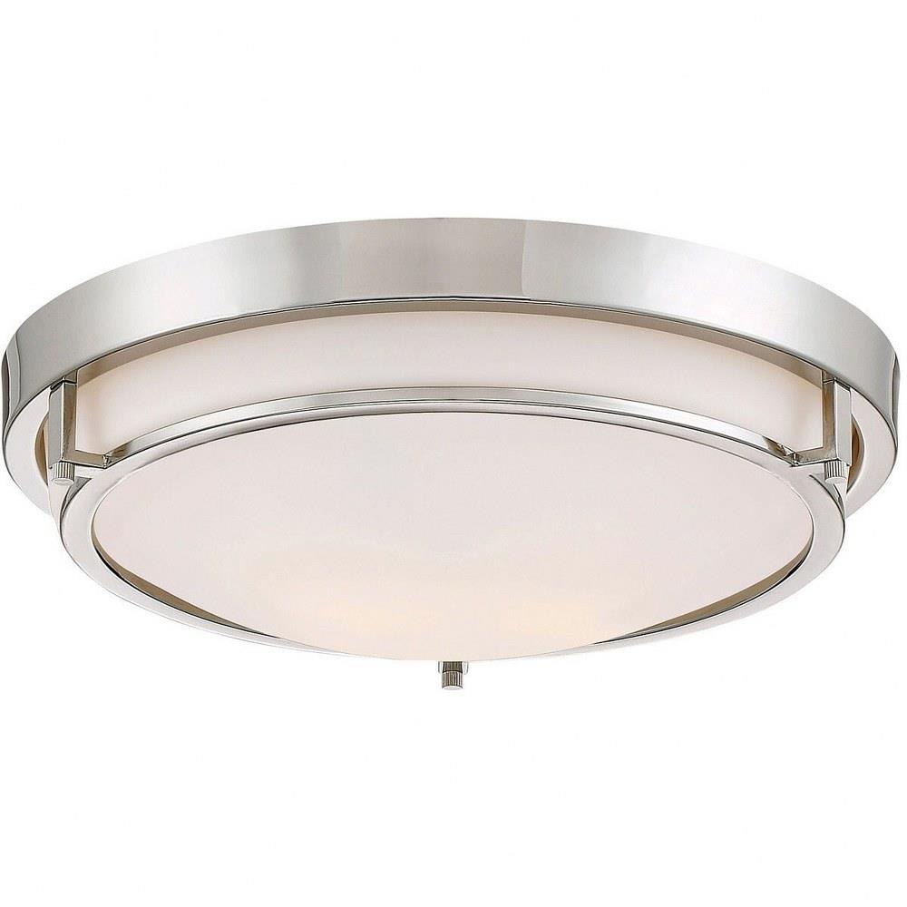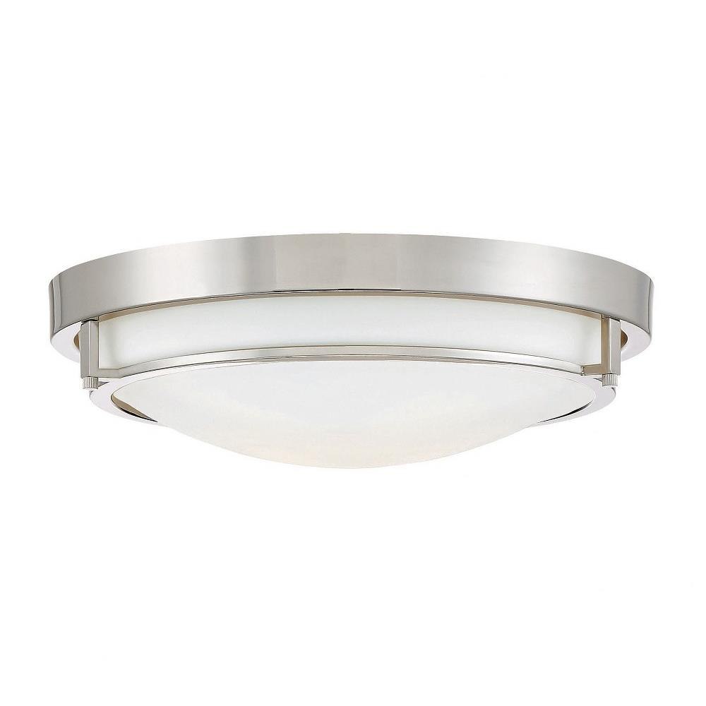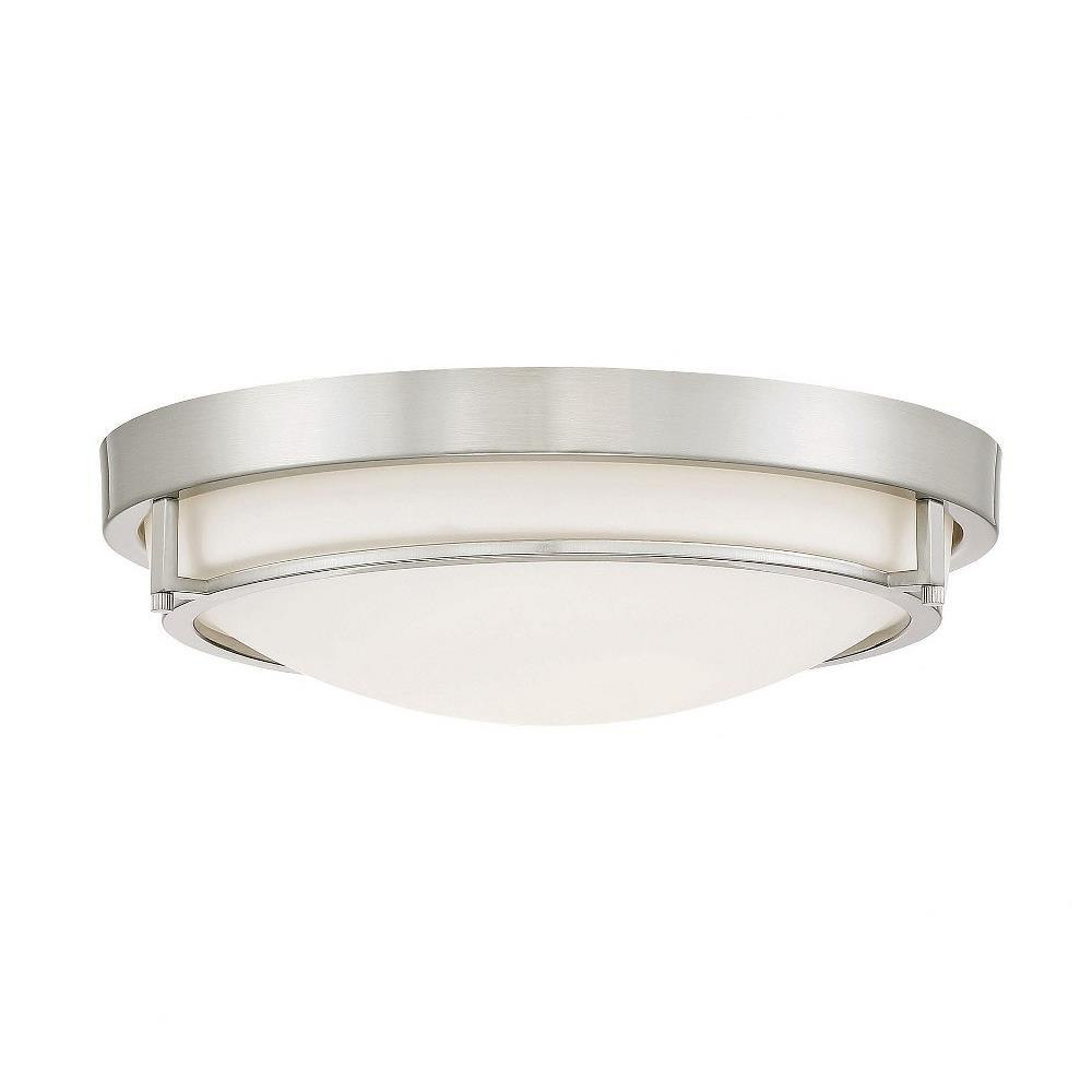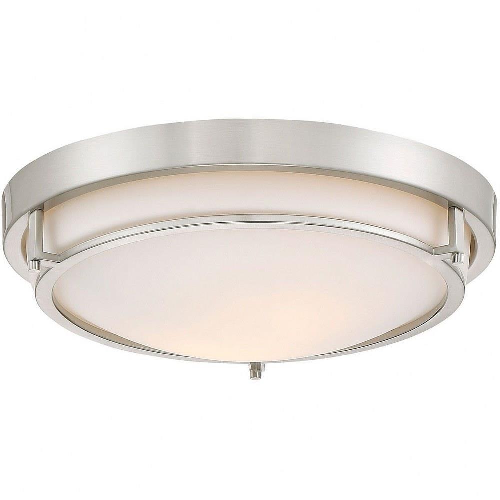 This slim and sleek 2-light ceiling flush mount offers a white glass shade and Brushed Nickel finish to beautify any room.