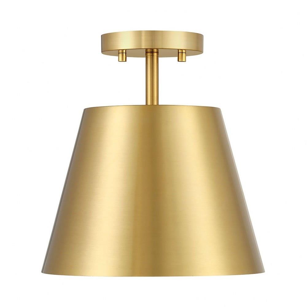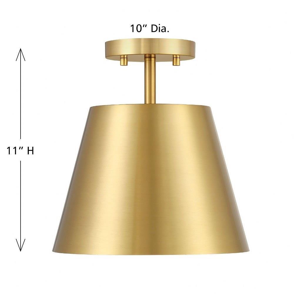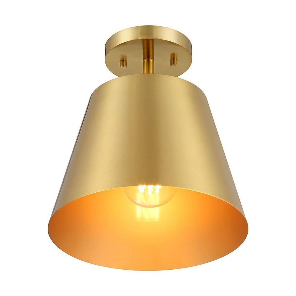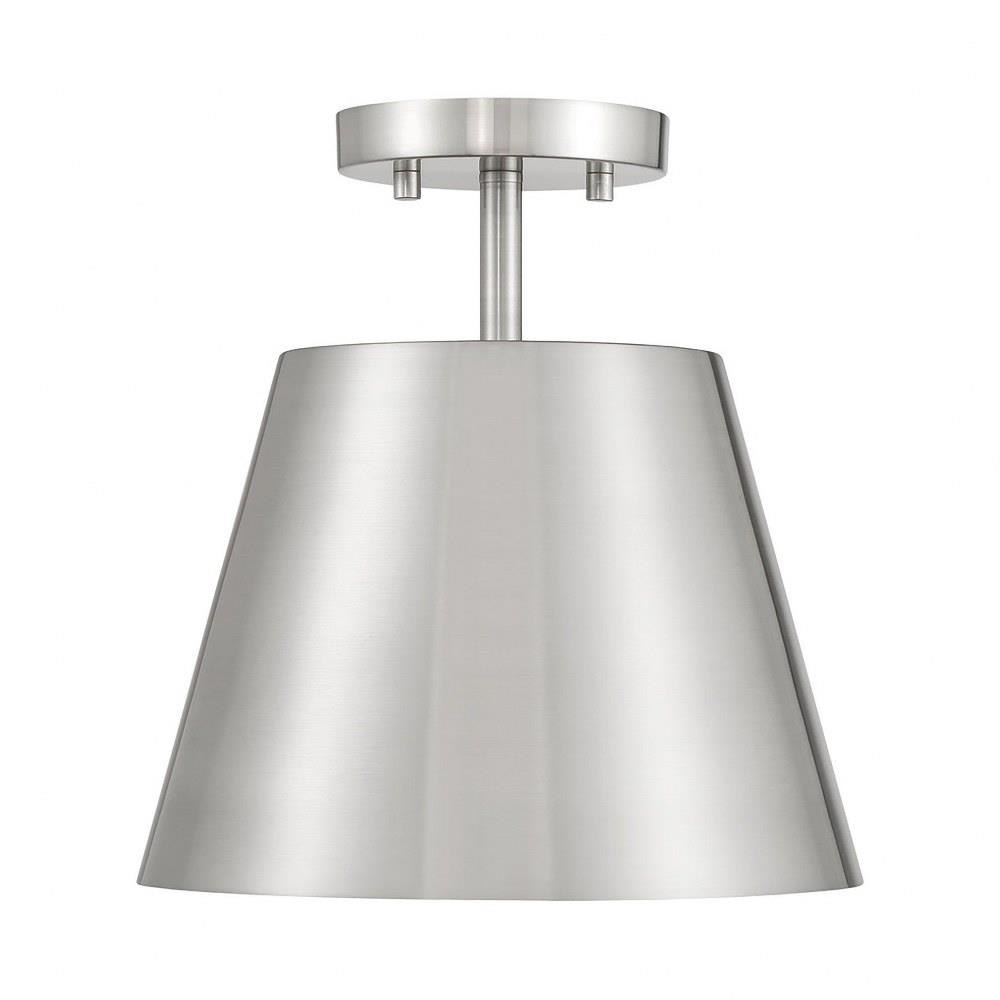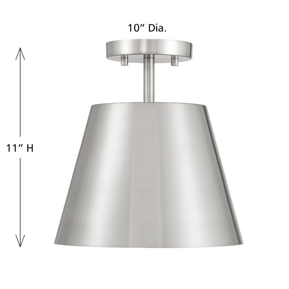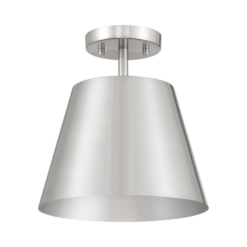 This sleek, chic 1-light ceiling semi-flush mount has a bold solid metal shade to concentrate and direct the light for a bright and dramatic glow. Its Brushed Nickel finish heightens the appeal. 11" height, 10" width, uses 1 standard size bulb of up to 60 watts. Bulb not included.