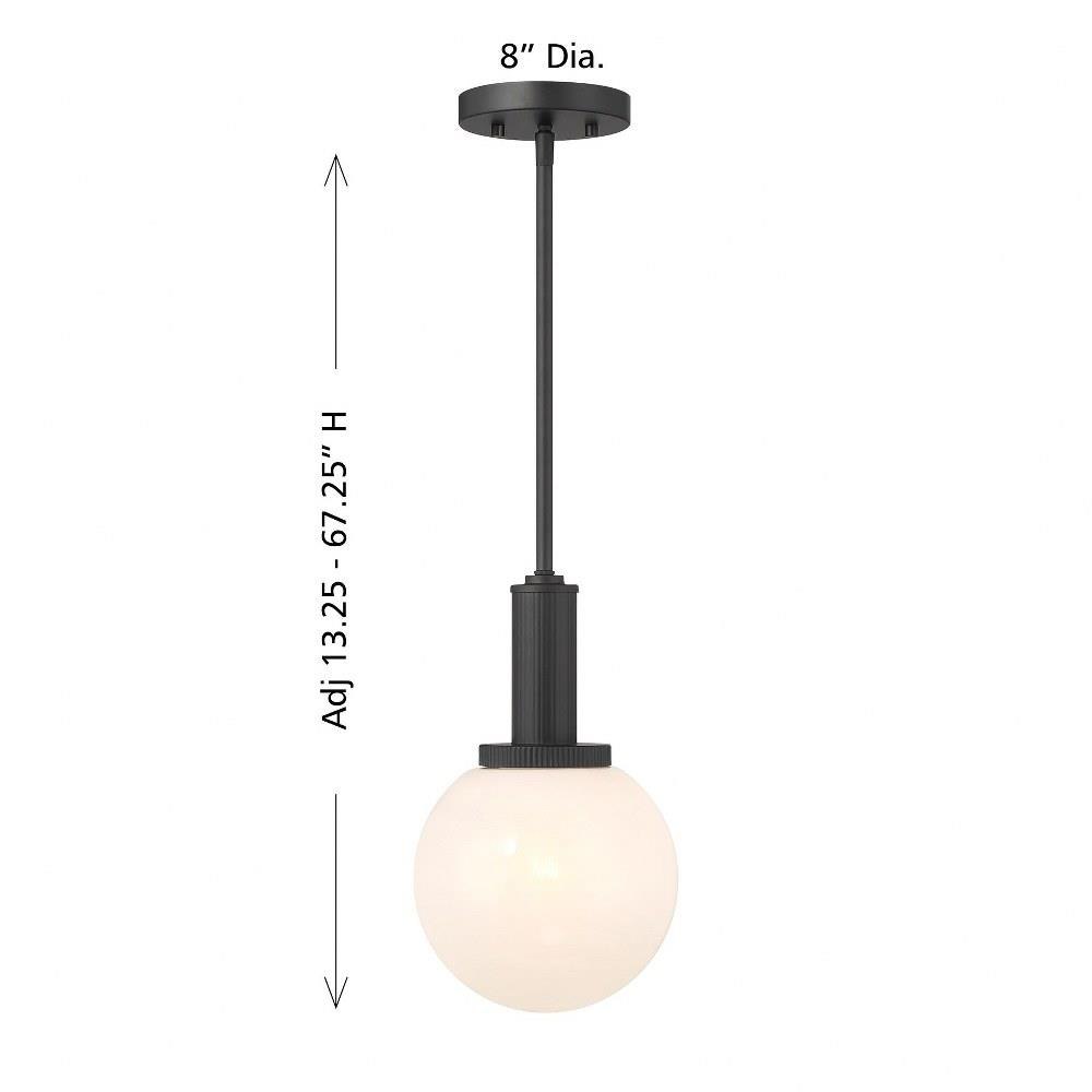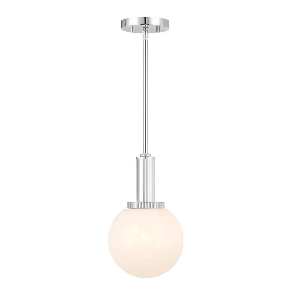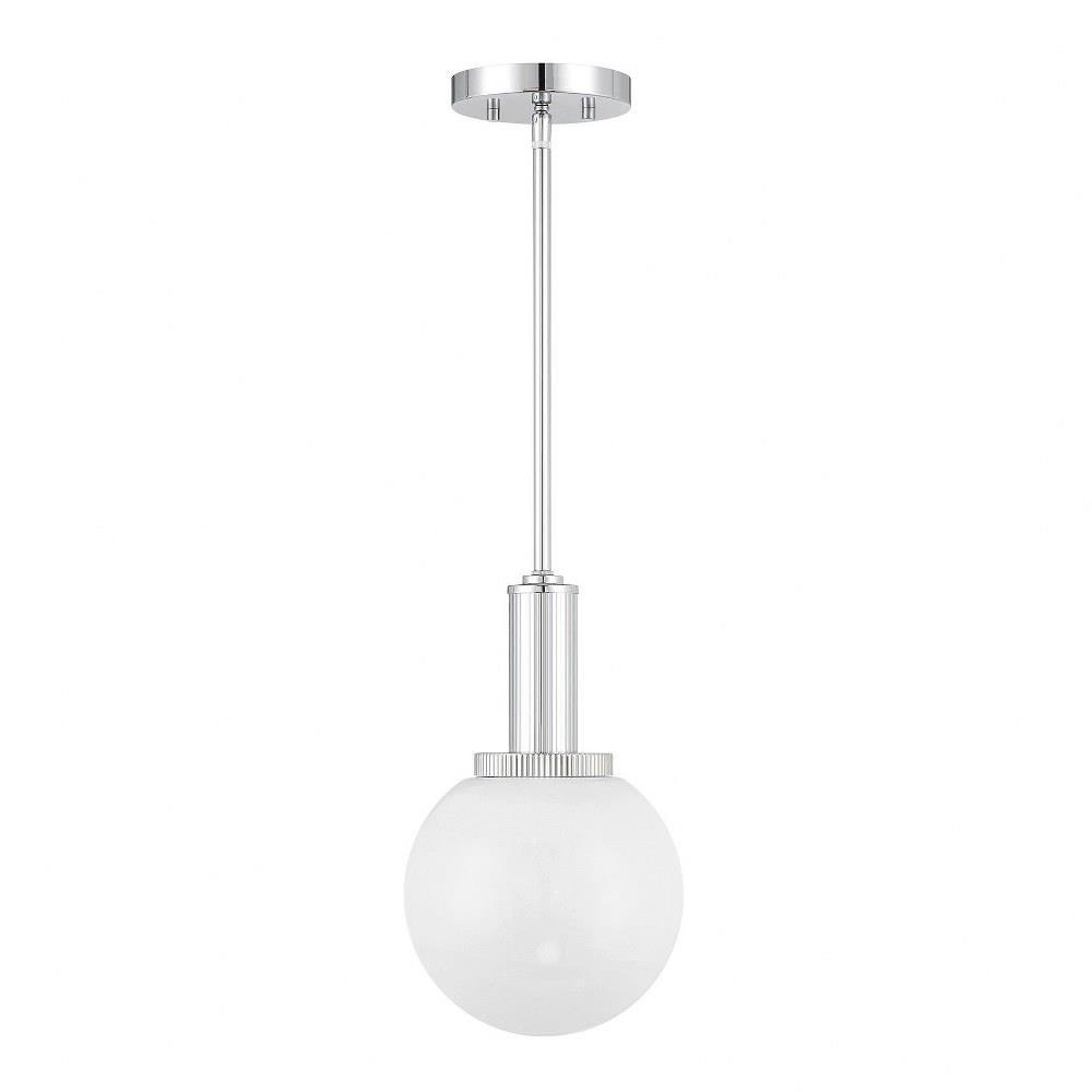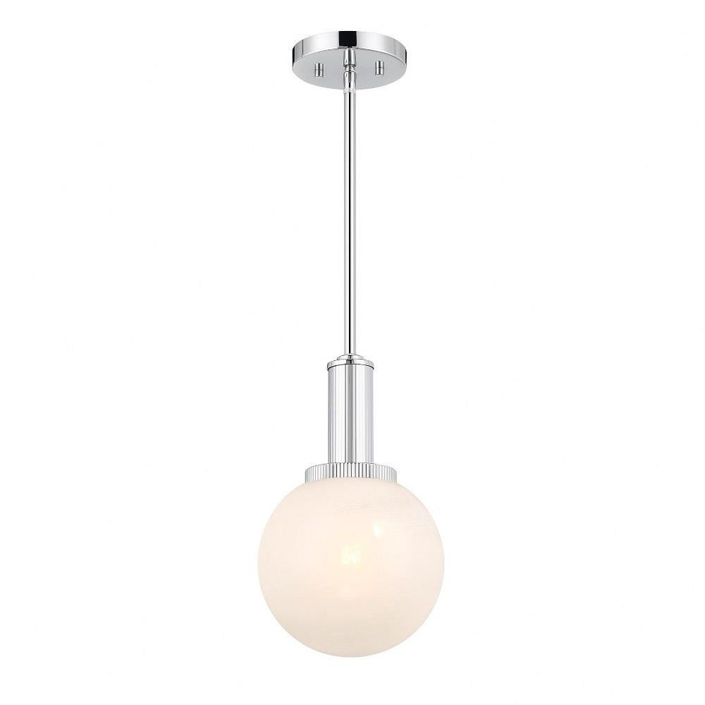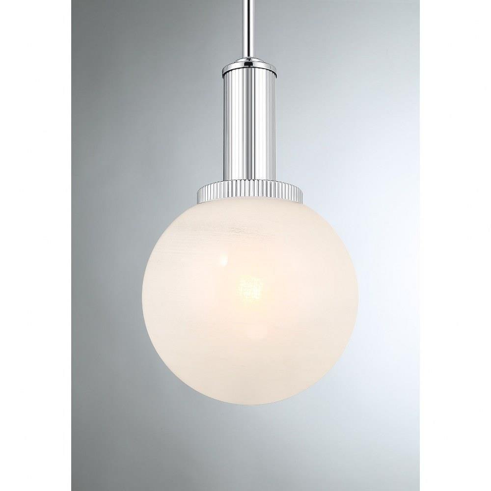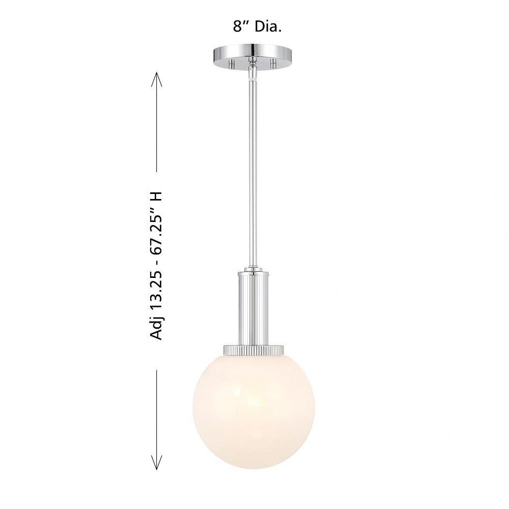 Add a little touch of magic to any room with this 1-light pendant. Its streamlined design allows a beautiful orb of strie glass to take center stage. The glass features dazzling swirls that draw the eye, soften the glow and work beautifully with the Chrome finish. Adjustable height ranges from 13.25" to 67.25". Comes with four 12" downrods and one 6" downrod. 8" width. Uses 1 standard size bulb of up to 60 watts. Bulb not included.