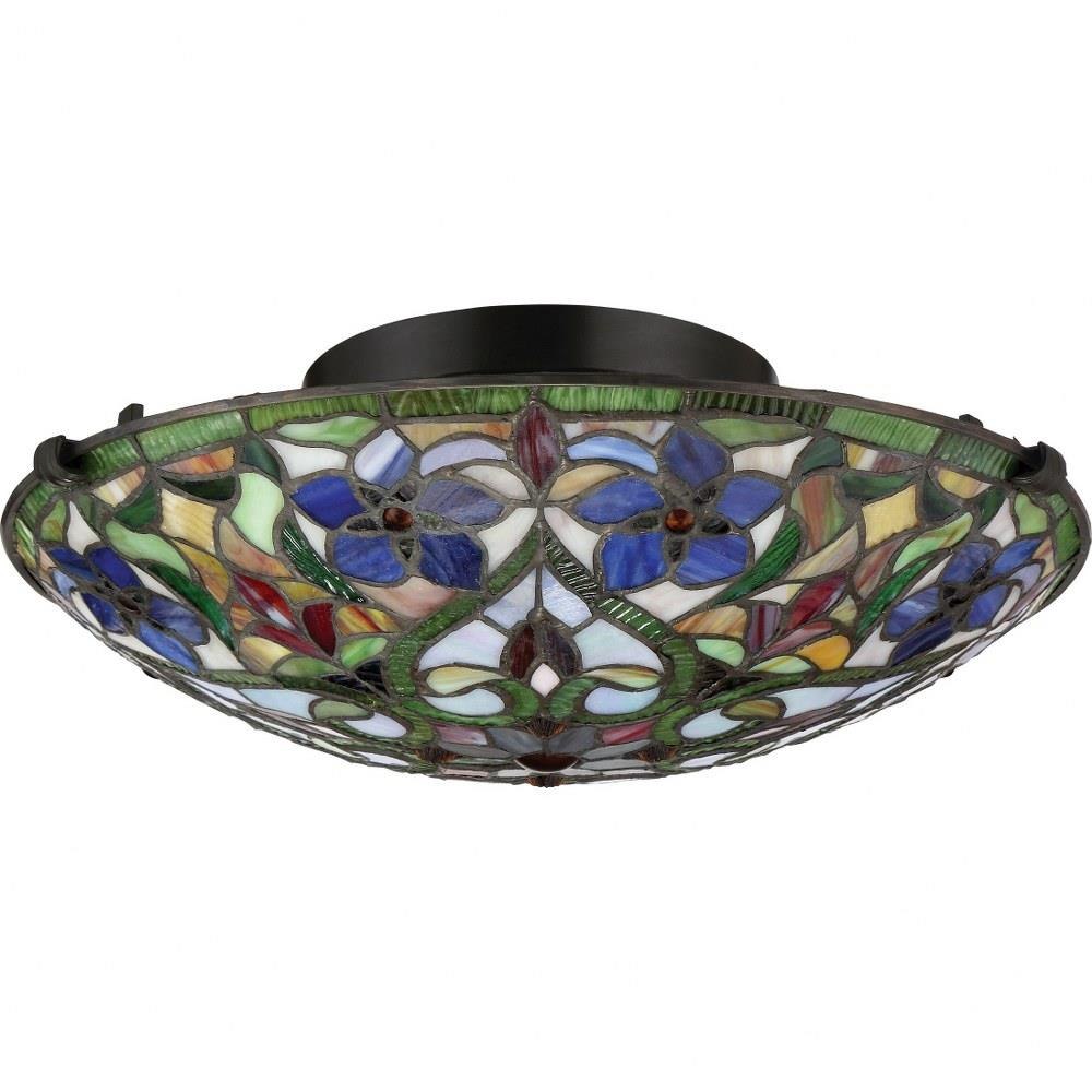 The elegant Violets - VB Vintage Bronze Finish Flush Mount are an enhancement to any home decor from the rustic to the most modern of homes. Product Design Style: Traditional Product Finish: VB - Vintage Bronze Product Electical: 2-75W, A19 MED (18W CFL) Product Shade: Shade 1: G12873SH Tiffany Glass 3.5" x 15.75" x 15.75" Contains 361 pieces.