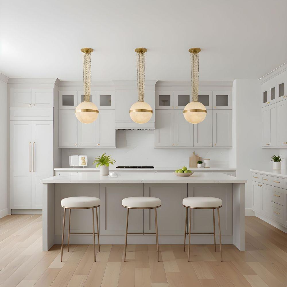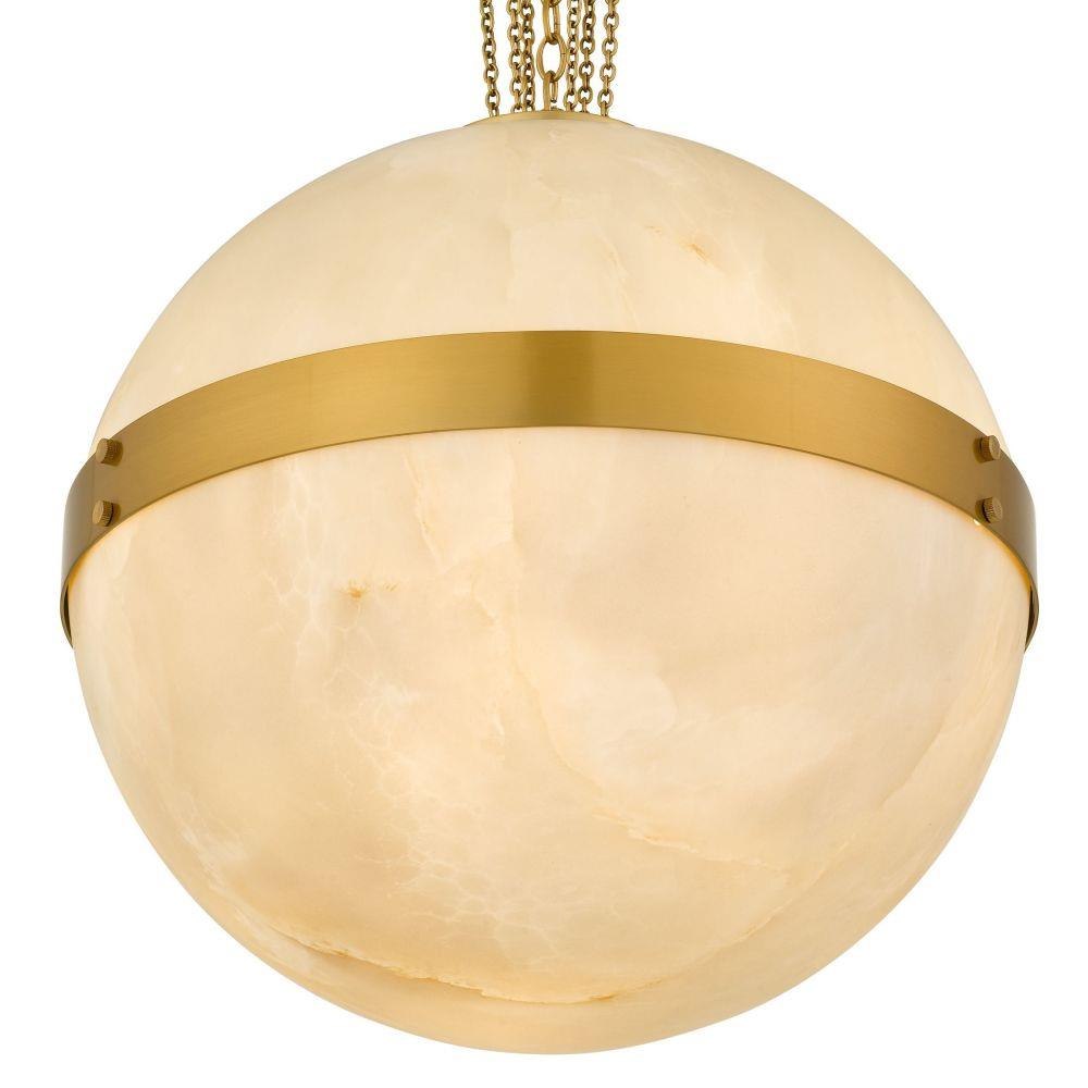 Elevate your space with the timeless romance of the Amato Pendant Light. Featuring a warm brushed gold finish and a glowing alabaster glass globe, this pendant evokes the soft allure of moonlight captured in a sphere. The water transfer shade on the glass adds a delicate marbled texture, like wisps of cloud drifting through amber skies. Suspended by graceful gold chains, the Amato blends classic charm with modern elegance—an artful centerpiece that radiates warmth and intimacy in any room.