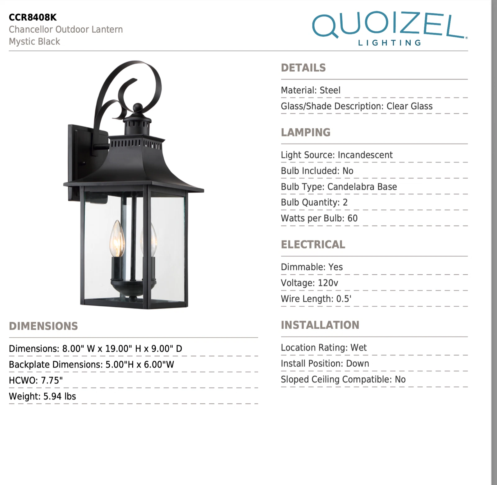 Quoizel CCR8408K Chancellor 2 Light 19 inch Mystic Black Outdoor Wall Lantern