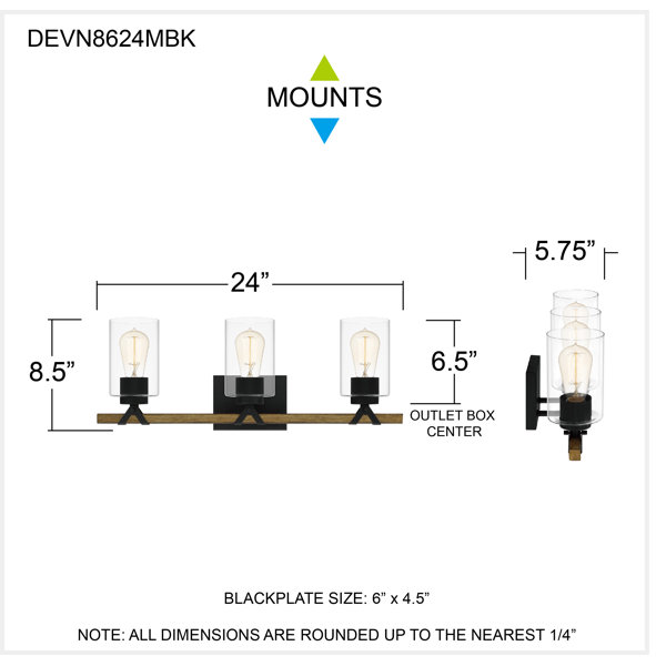 This 3-light vanity fixture adds a breezy two-tone finish to your bathroom, merging industrial and farmhouse styles. Crafted from black steel, it includes a rectangular backplate and a holder that also wraps around a wood-finished horizontal bar to bring out the contrasting hues. This vanity light is able to mount facing up or down, with three clear cylindrical glass shades surrounding 100W max bulbs (sold separately). It's compatible with dimmer switches, letting you control the amount of brightness you want. Plus, it's rated for damp locations, so it's safe for bathrooms that receive excess moisture.