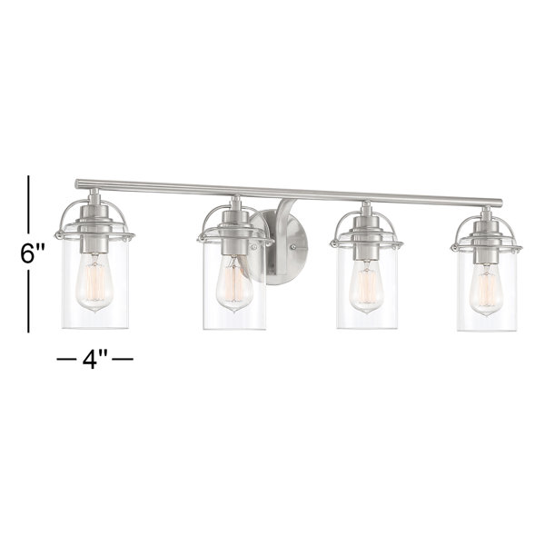 A sleek and modern design gets a splash of nautical style with this four-light vanity light. Rated for use in damp locations like a steamy powder room, this metal fixture features a round backplate, a slender horizontal rod, and four wiry lantern-like supports in a brushed nickel finish for contemporary appeal. Clear glass cylindrical shades round out the design, providing a peek at compatible 100 W medium-base bulbs (not included) ensconced within.