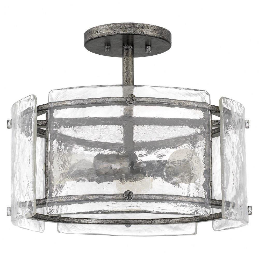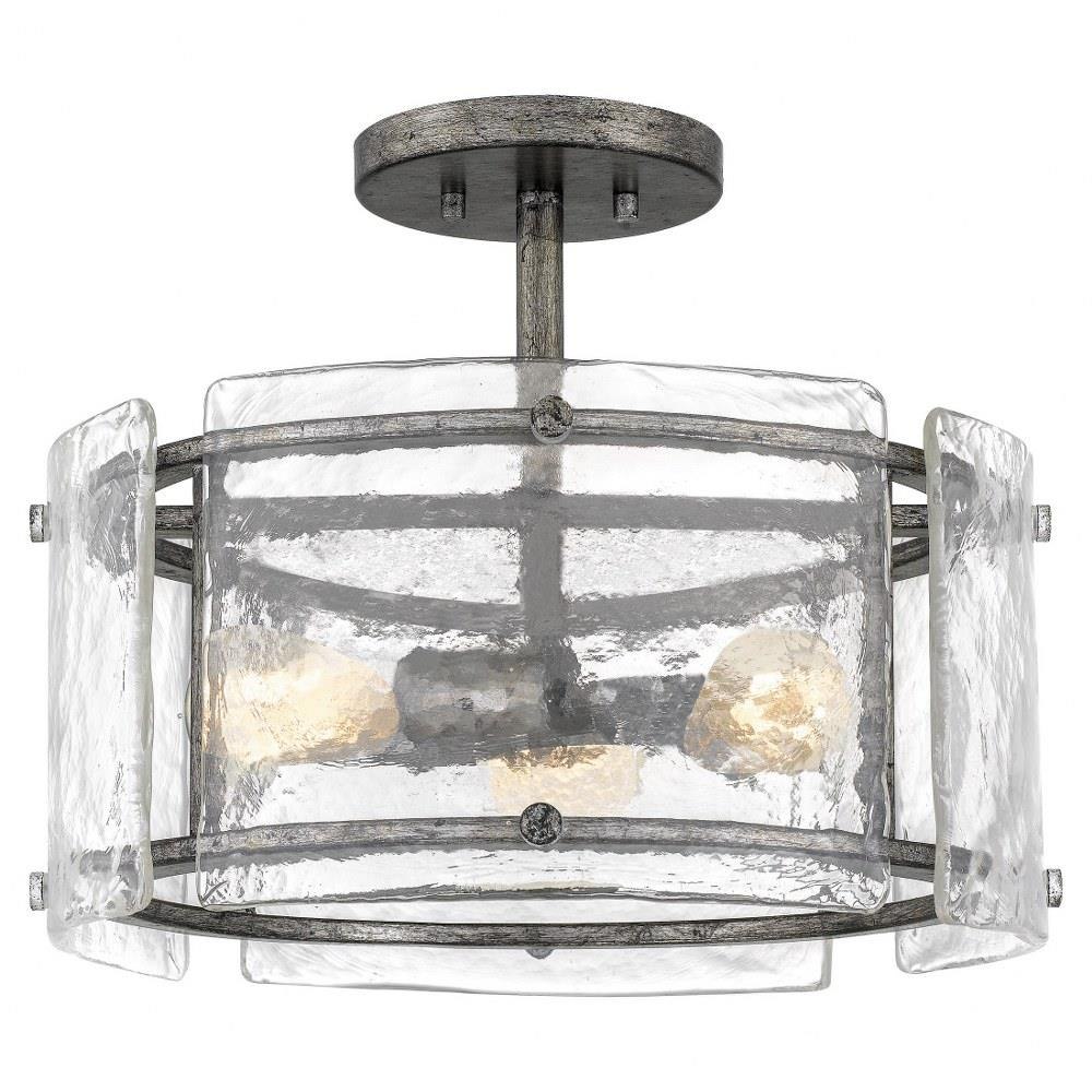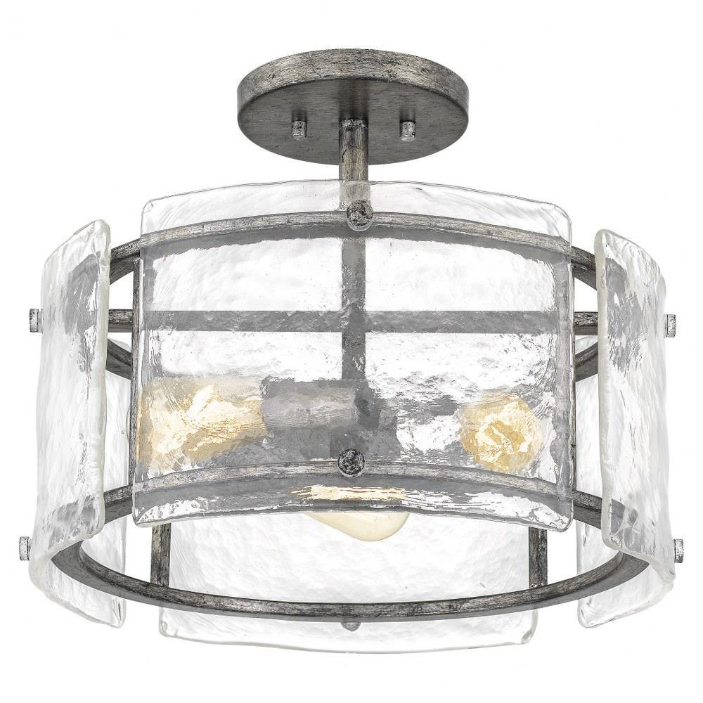 Rated for use outdoors or in, the rustic styling of the Fortress gives it an artisanal edge. Thick slabs of textured glass float around the mottled silver frame, secured with coordinating bolts. A hazy treatment of the glass is reminiscent of days gone by. Durable steel construction is built to last and offers a clean, polished look Includes all required hardware, template, and instructions for easy installation ETL Listed for use in damp locations Fixture is dimmable when paired with dimming-compatible bulbs Requires 3 100-watt medium base bulbs (sold separately).