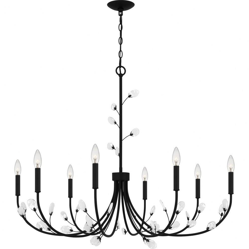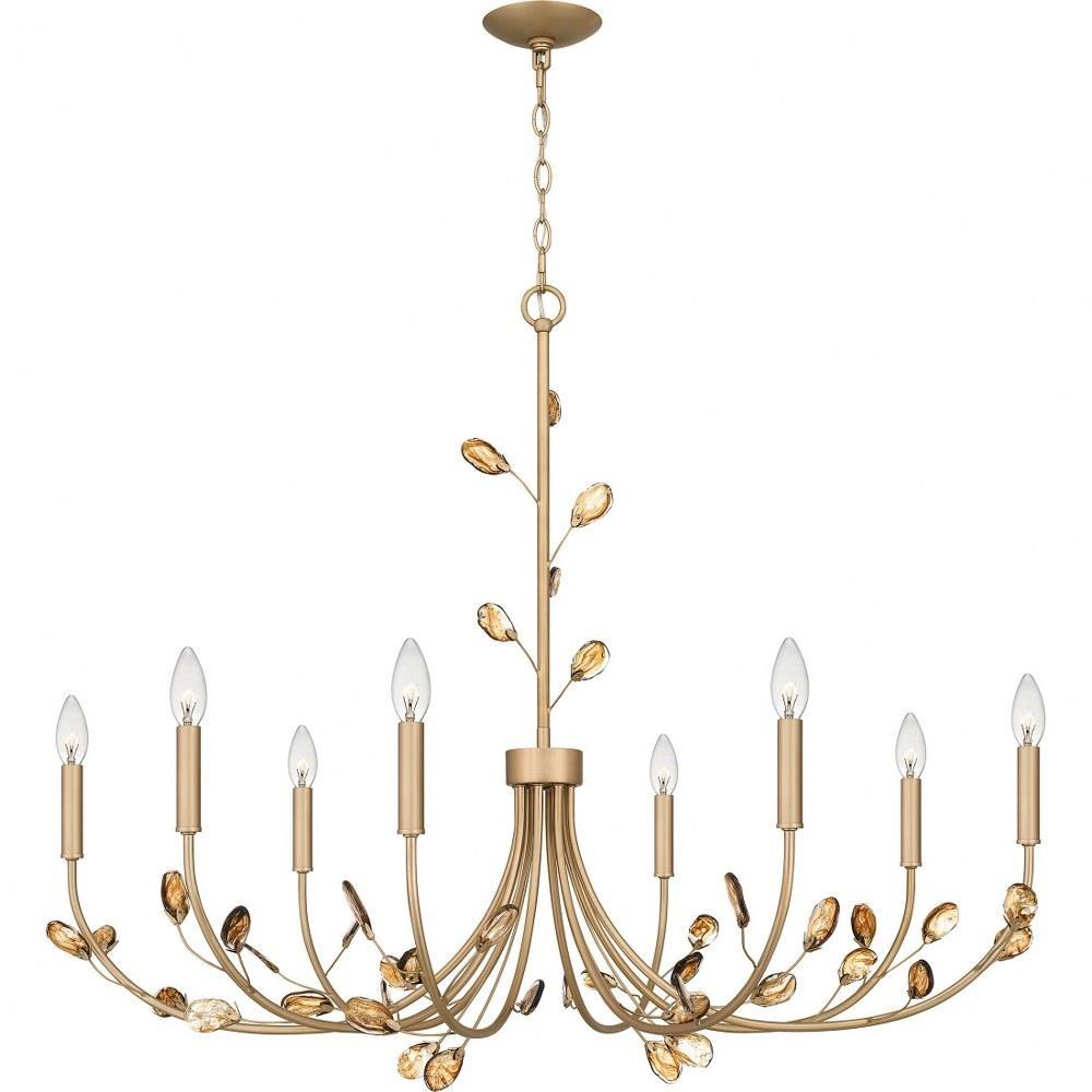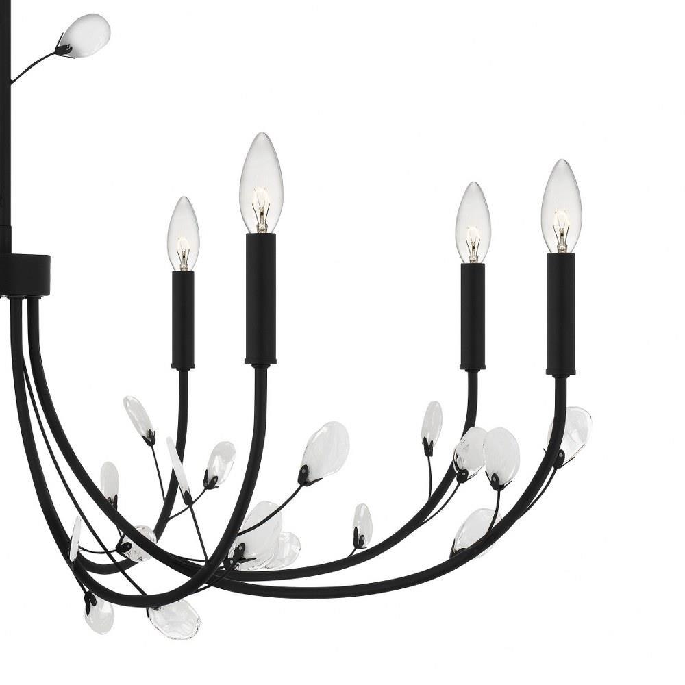 Heiress offers a fresh new take on a classic chandelier design. Choose from a bronze gold finish with light amber swirling glass leaf accents or a matte black finish with clear and white swirling glass leaf accents. All leaves have a little variation due to their unique nature, creating a one-of-a-kind statement piece over any dining room or living room table.
