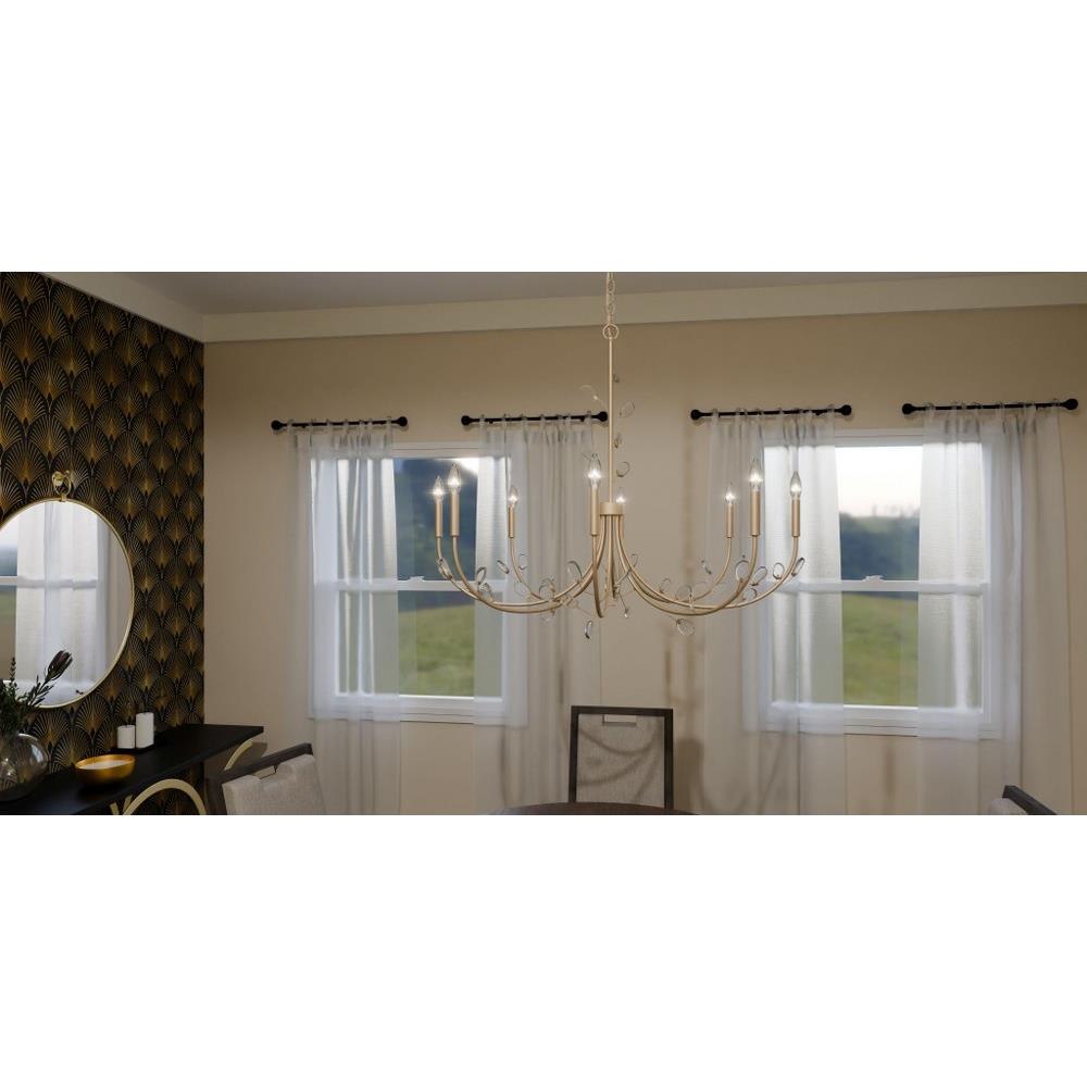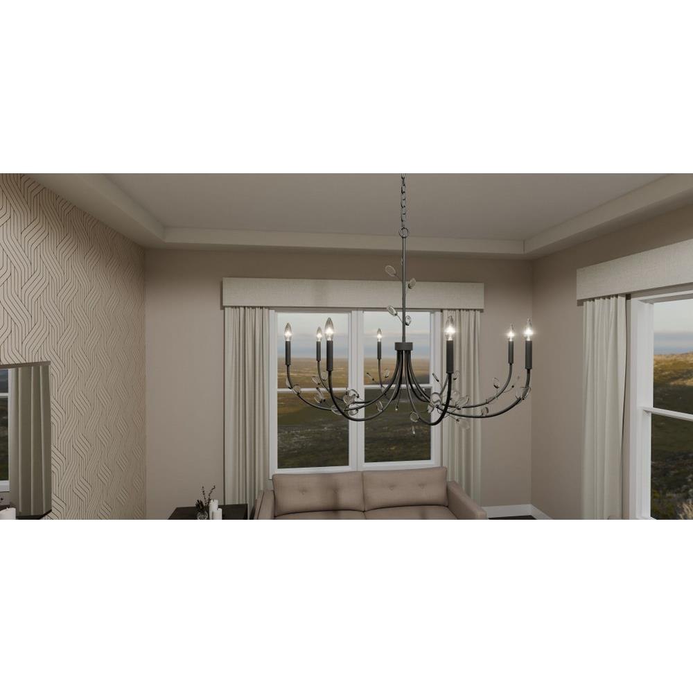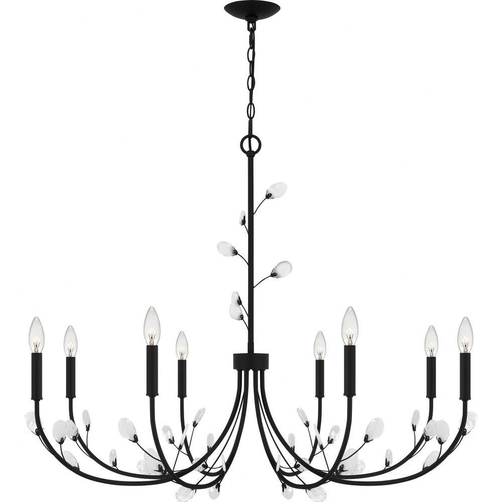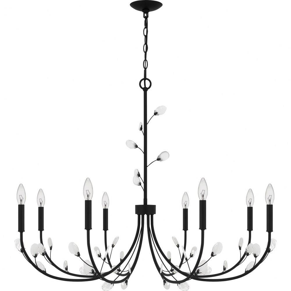 Heiress offers a fresh new take on a classic chandelier design. Choose from a bronze gold finish with light amber swirling glass leaf accents or a matte black finish with clear and white swirling glass leaf accents. All leaves have a little variation due to their unique nature, creating a one-of-a-kind statement piece over any dining room or living room table.