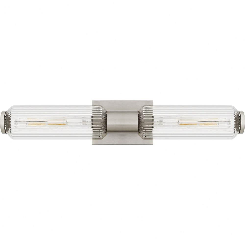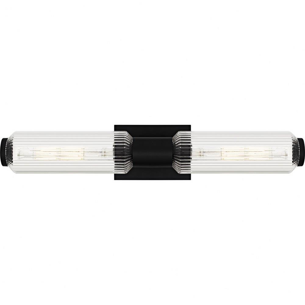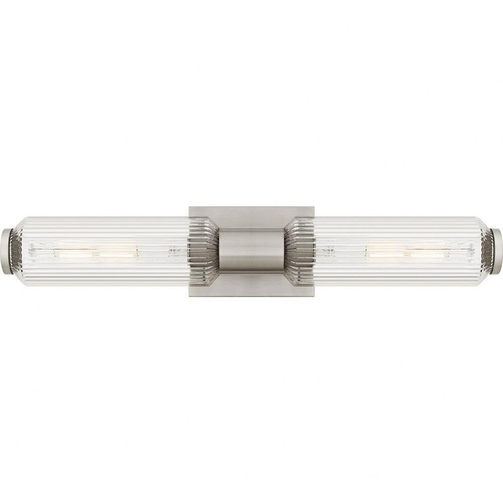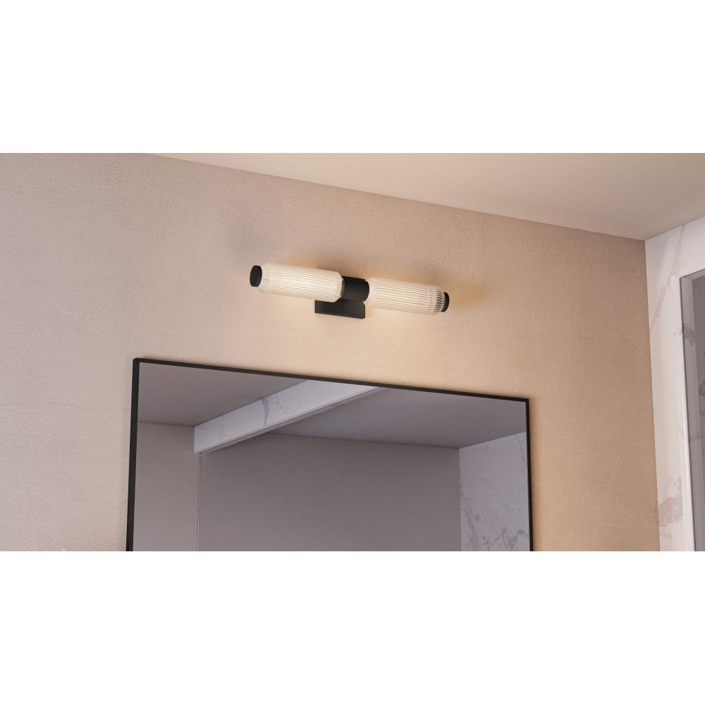 The Hawes bath light features a clean, geometric design with a striking visual impact. The two cylindrical ribbed glass shades cast a soft, diffused glow while adding a touch of texture to the space. The light's slender metal backplate, available in a versatile brushed nickel or matte black finish, complements a range of modern and minimalist bathroom styles. Place Hawes vertically on either side of a vanity mirror or horizontally above a mirror - or use as a wall sconce in a variety of other settings.