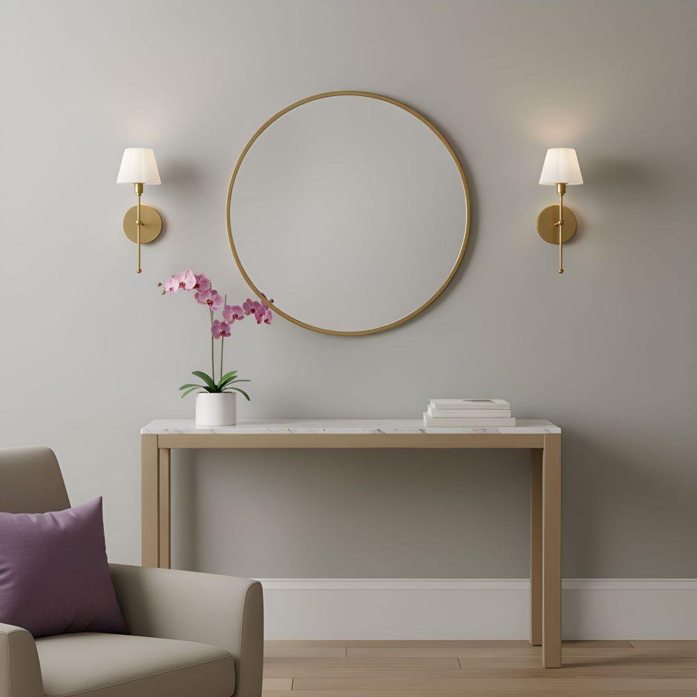 Graceful and quietly radiant, the Irena Wall Sconce brings a soft, romantic glow to any room. Its sculptural stem—available in brushed gold or matte black—adds a touch of modern elegance, while the opal etched glass shade diffuses light like a gentle whisper. Whether flanking a mirror or lining a hallway, Irena creates a mood that feels both timeless and tender—an everyday moment wrapped in warmth.