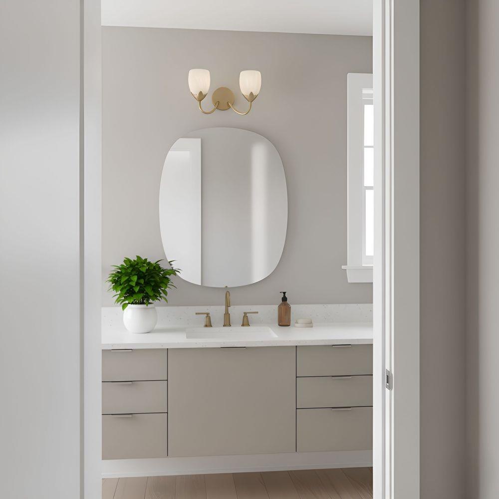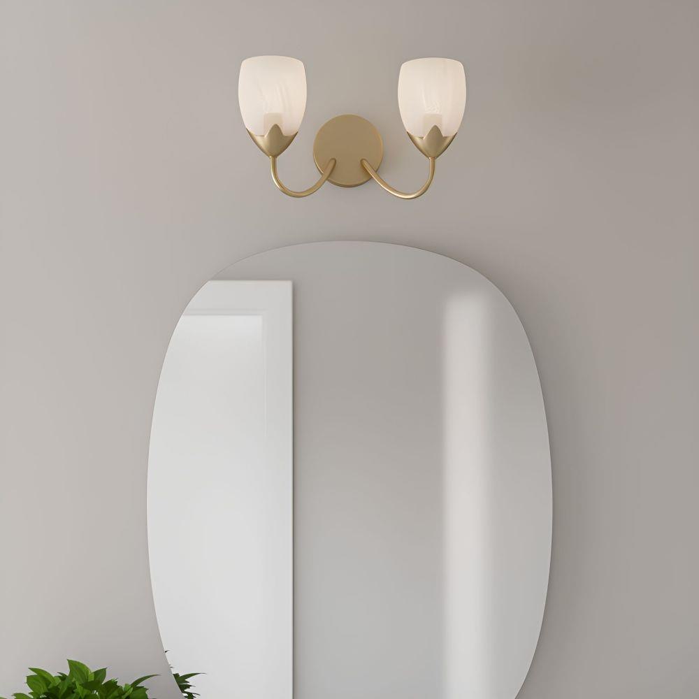Elegant curves and soft, glowing beauty define the Jacobs Collection—a delicate balance of form and feeling. Finished in a warm bronze gold, its gracefully arched arms and petal-like cups cradle tulip-shaped etched alabaster glass shades, casting a light that feels tender and timeless. Available in multiple vanity sizes and as a single-light sconce, Jacobs is designed to bloom beautifully in any space—from cozy powder rooms to grand master baths. With every switch, it invites you into a moment of quiet luxury and refined romance.
