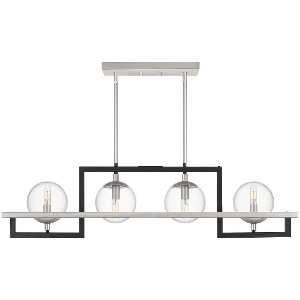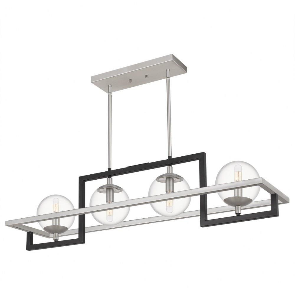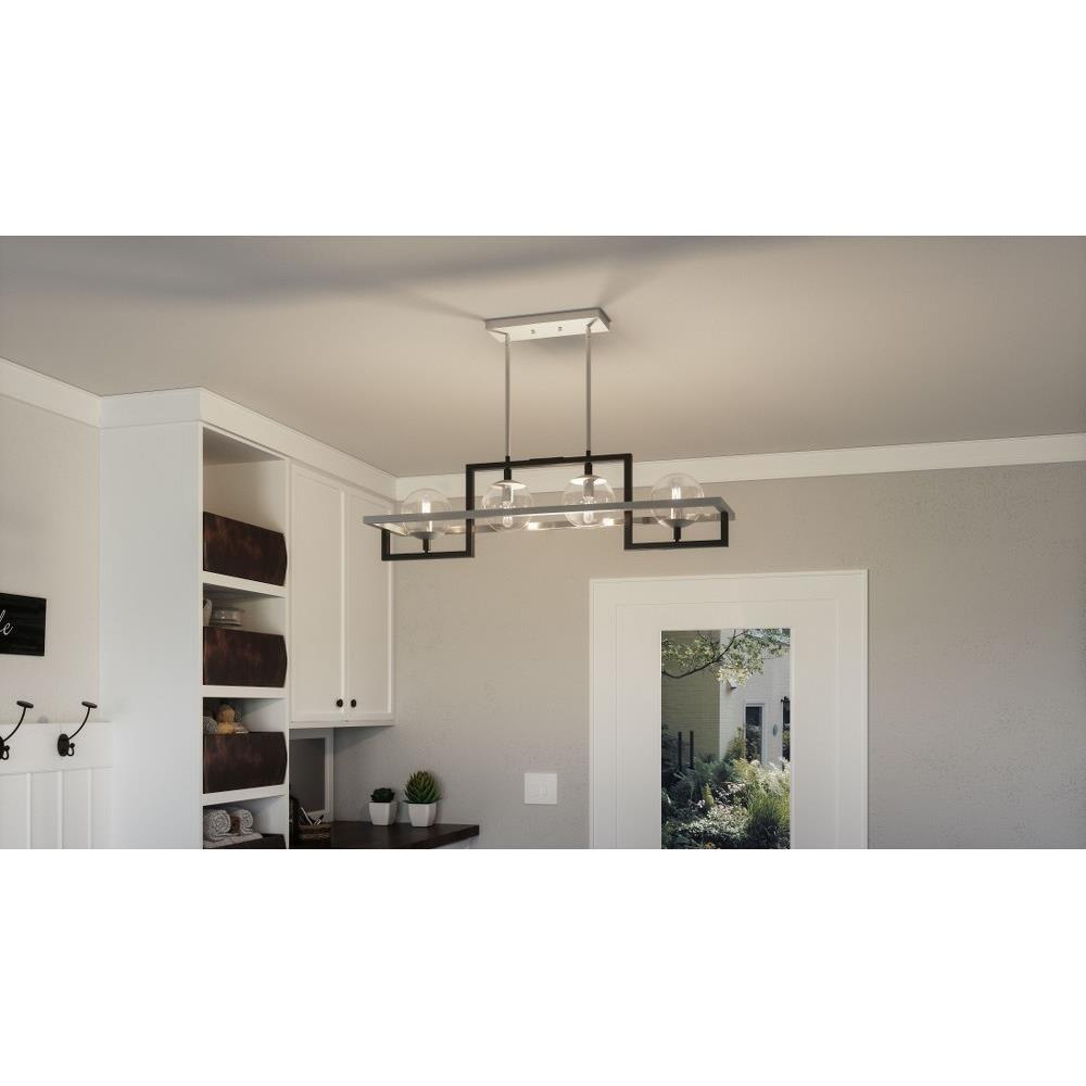 Kane embodies Art Deco moderne. This geometric series cuts a bold shape in a mix of earth black and steel, creating a made-to-order, high-design look without the high price tag. Whether above a dining table or in a living or family room, Kane is the new heirloom: an instant focal point for modern spaces.10.50" H 40.00" W 10.50" L, Bulb Type CAND BASE B10, Bulb Qty 4, Base Finish EK - Earth Black, Item Weight 23.40, Product Design Style: Contemporary Product Finish: Black Product Electrical: 4 x 60w Candelabra Base Product Shade: Clear Glass Product Warranty: Product Warranty: Indoor Lighting Fixtures-Electrical Components [1 Year], Integrated LED (LED Bulbs Excluded)[5 Years], Finish[1 Year]; Outdoor Lighting Fixtures-Electrical Wiring & Sockets [1 Year], Integrated LED (LED Bulbs Excluded)[5 Years], "Armour" Finish[5 Years], Finish[2 Years].