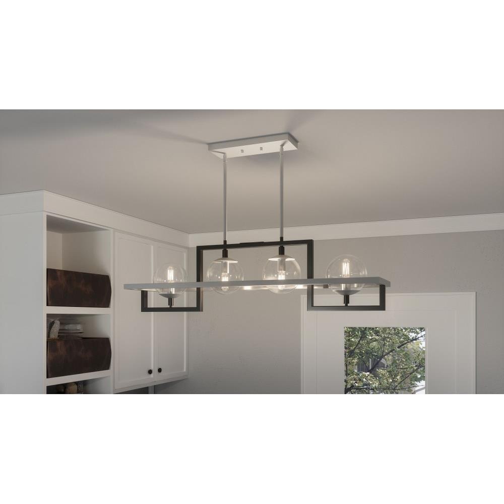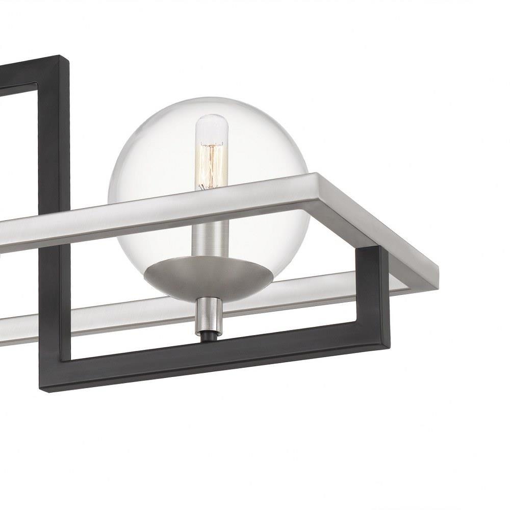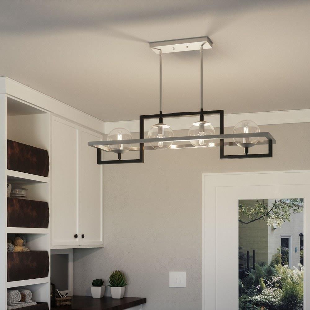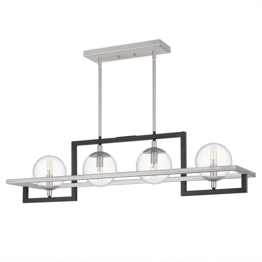 Kane embodies Art Deco moderne. This geometric series cuts a bold shape in a mix of earth black and steel, creating a made-to-order, high-design look without the high price tag. Whether above a dining table or in a living or family room, Kane is the new heirloom: an instant focal point for modern spaces.10.50" H 40.00" W 10.50" L, Bulb Type CAND BASE B10, Bulb Qty 4, Base Finish EK - Earth Black, Item Weight 23.40, Product Design Style: Contemporary Product Finish: Black Product Electrical: 4 x 60w Candelabra Base Product Shade: Clear Glass Product Warranty: Product Warranty: Indoor Lighting Fixtures-Electrical Components [1 Year], Integrated LED (LED Bulbs Excluded)[5 Years], Finish[1 Year]; Outdoor Lighting Fixtures-Electrical Wiring & Sockets [1 Year], Integrated LED (LED Bulbs Excluded)[5 Years], "Armour" Finish[5 Years], Finish[2 Years].