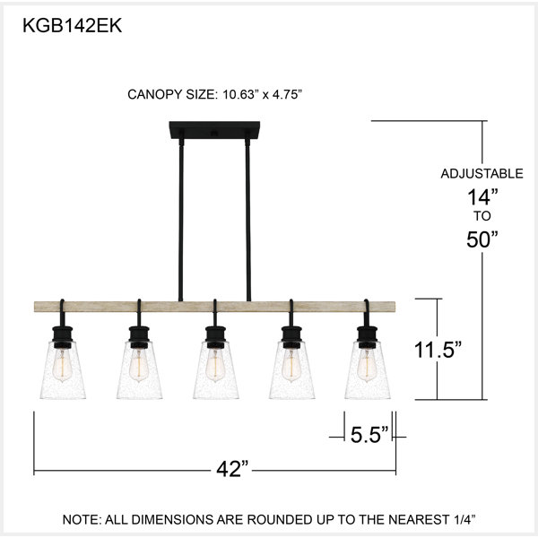 As a linear island light, the dazzles with a tidy row of seeded glass shades, complemented by wood and iron. An earth black finish completes the look and adds an industrial touch.