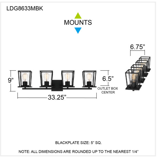 Sleek and streamlined, this 4-light vanity fixture puts a modern twist on a coastal cottage vibe. Crafted from steel with an industrial black finish, it includes a rectangular backplate and a horizontal bar that keeps in place all four holders. The 100W max bulbs (sold separately) and clear seeded drum shades are showcased within open, tapered frames that match the rest of the piece. This vanity light is compatible with dimmer switches, making it easy to control the level of brightness in your bathroom. Plus, it's damp-rated, so it's safe for high-moisture environments.
