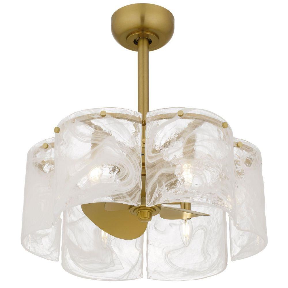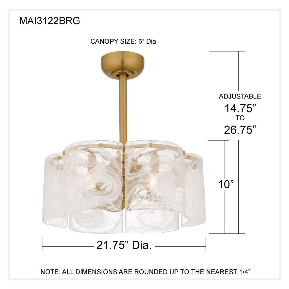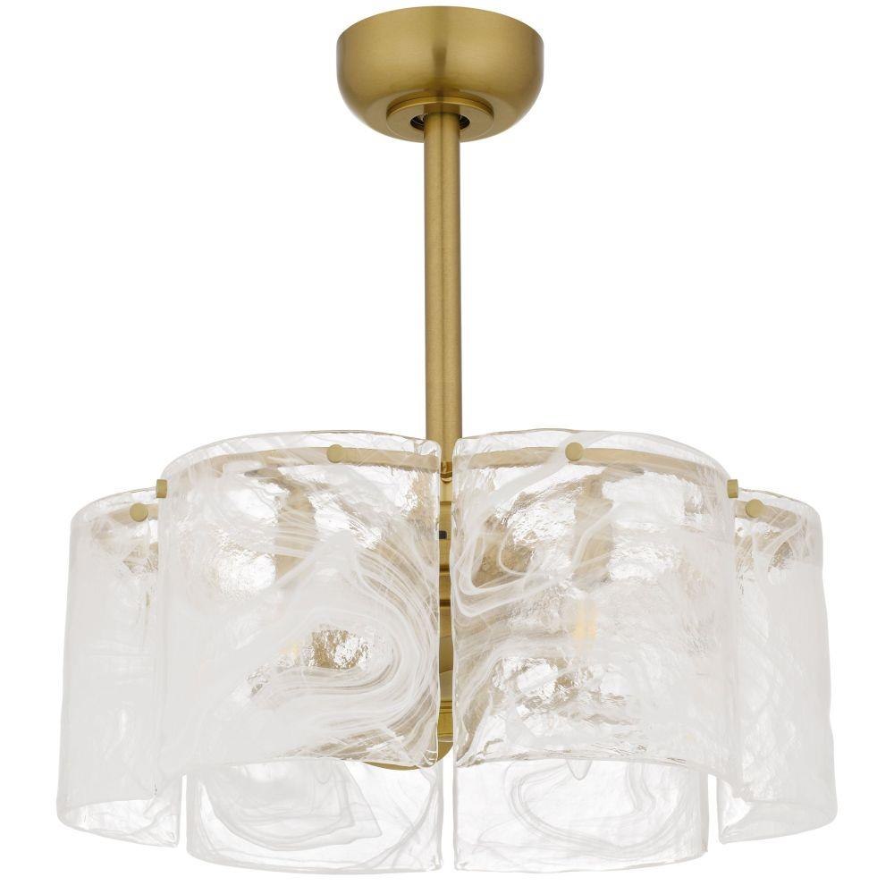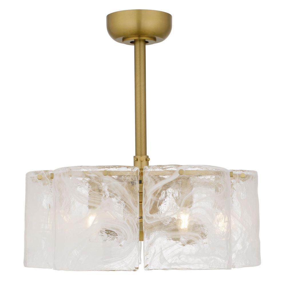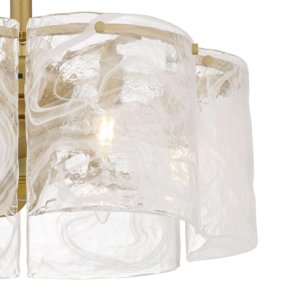 Maisie captures the soft poetry of air and light in motion. Gently curved panels of white swirl glass surround the fixture like flowing silk, their delicate patterns evoking wisps of clouds on a golden afternoon. Each glass piece is uniquely marbled, creating a luminous effect that shifts with every glance. Anchored in a warm brushed gold frame, Maisie feels both airy and grounded—an elegant fusion of modern form and timeless romance.