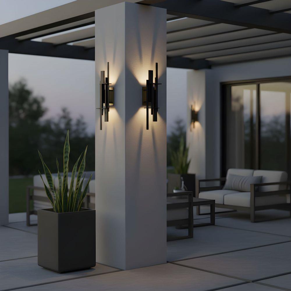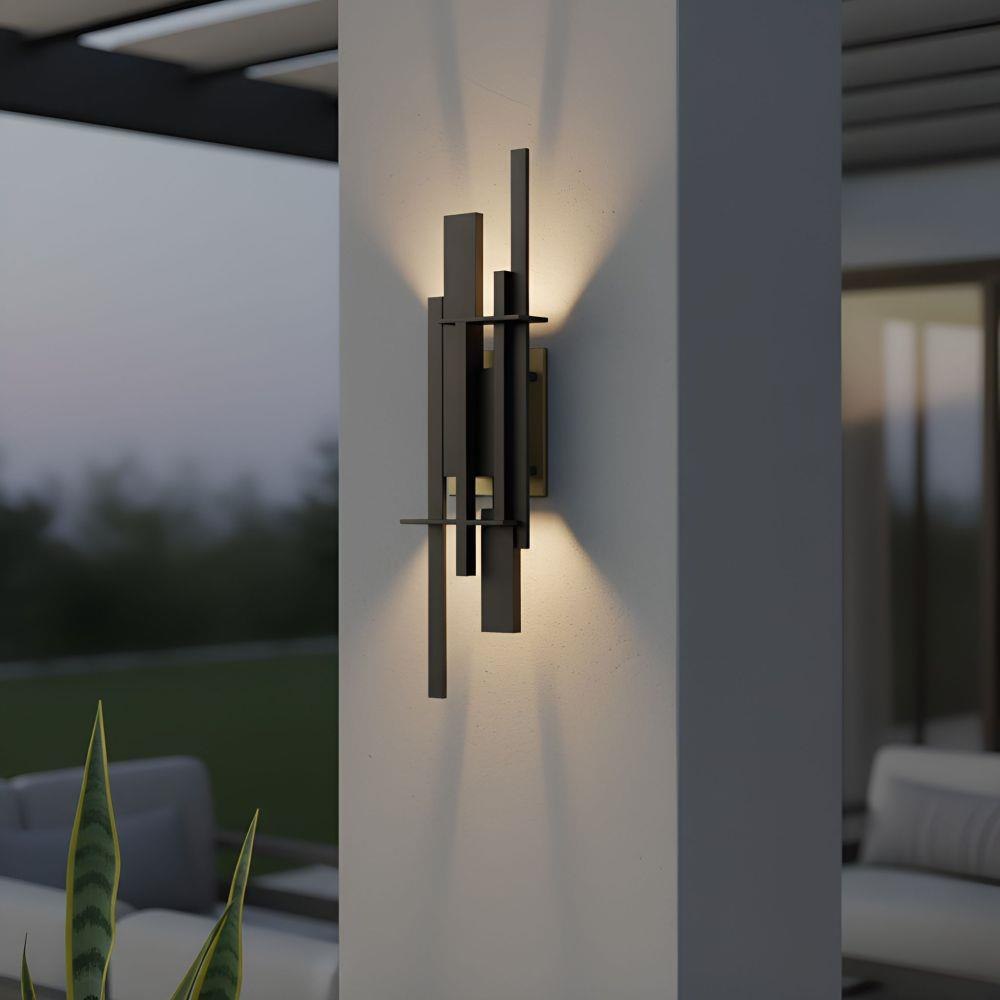 Bold and poetic, the Newton Outdoor Wall Lantern is more than illumination—it’s an artistic statement. Layers of slender, earth black bars rise and intersect like a modern skyline, creating a dynamic play of form and silhouette. Hidden within, a soft glow radiates against the golden interior, casting an inviting warmth that feels both contemporary and timeless. Perfect for entryways, patios, or pathways, Newton transforms your exterior into a gallery of light—where architecture meets romance under the evening sky.