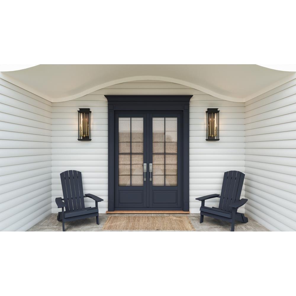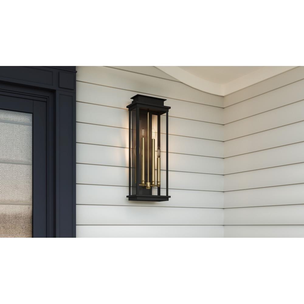 Inspired by traditional lanterns, Noelle adds a new twist to a classic design. The slender silhouette is crafted from weather-resistant aluminum and finished in a sophisticated matte black. Clear glass panels showcase the gold candle sleeves, adding a touch of elegance and timeless style. The backplate features three mounting points, allowing you to customize the installation height in any front door or porch setting.