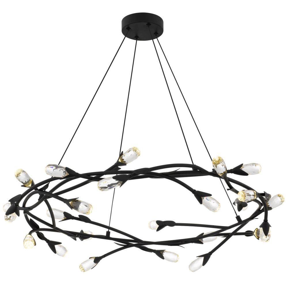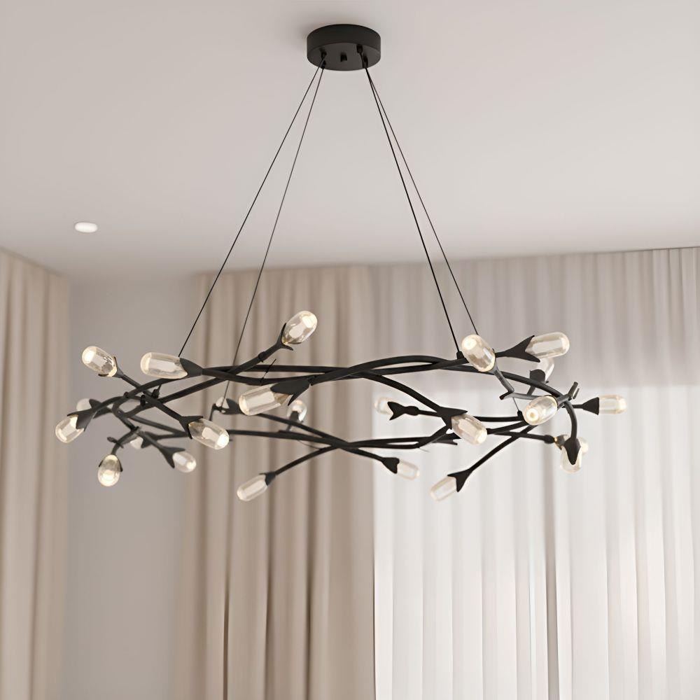 Gracefully suspended like a constellation frozen in time, Cora brings an air of effortless romance to any space. Its delicate branches intertwine in a poetic dance, each tipped with teardrop crystals that shimmer like morning dew. Whether in a warm gold leaf or a bold matte black finish, Cora becomes a sculptural statement — modern yet organic, dramatic yet serene. With integrated LED lights nestled within each crystal bloom, Cora casts a soft, radiant glow — perfect for dining rooms, bedrooms, or any modern space.