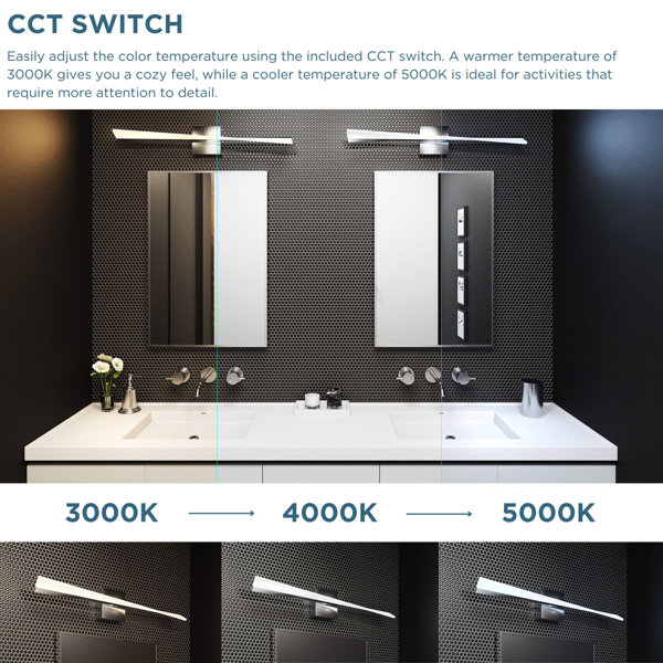 Contemporary and sleek, Fox bath lights are a perfect addition to the popular Platinum by Quoizel collection. With an integrated LED light source, this vanity light casts a perfect glow amid a sculptural, geometric silhouette. The polished chrome finish completes the look with timeless shine and style. This fixture also includes a CCT switch, allowing you to easily customize the brightness of the light. to your desired setting. Switch easily from 3000K to 4000K to 5000K. A warmer temperature of 3000K gives you a cozy feel, while a cooler temperature of 5000K is ideal for activities that require more attention to detail.