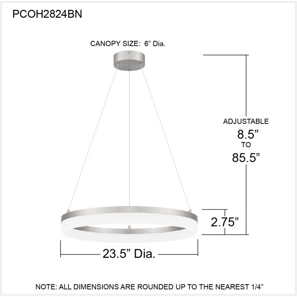 Sleek and striking, the minimalist Rosemount series hypnotizes with a halo-like ring of glowing LED light. Choose from a variety of style options from flush mount to chandelier, all featuring an etched acrylic shade and your choice of either brushed nickel or oil rubbed bronze finish. The chandelier style is suspended from steel cord, reinforcing a modern aesthetic.