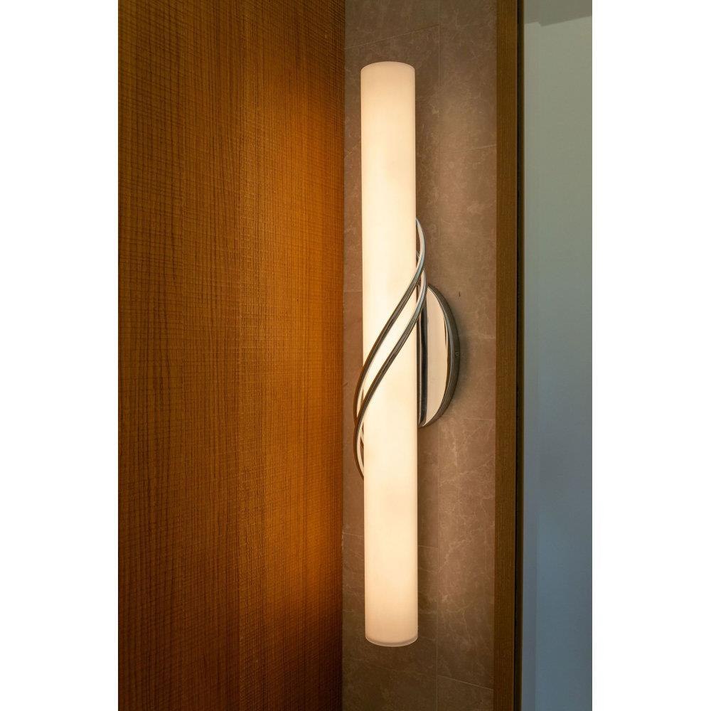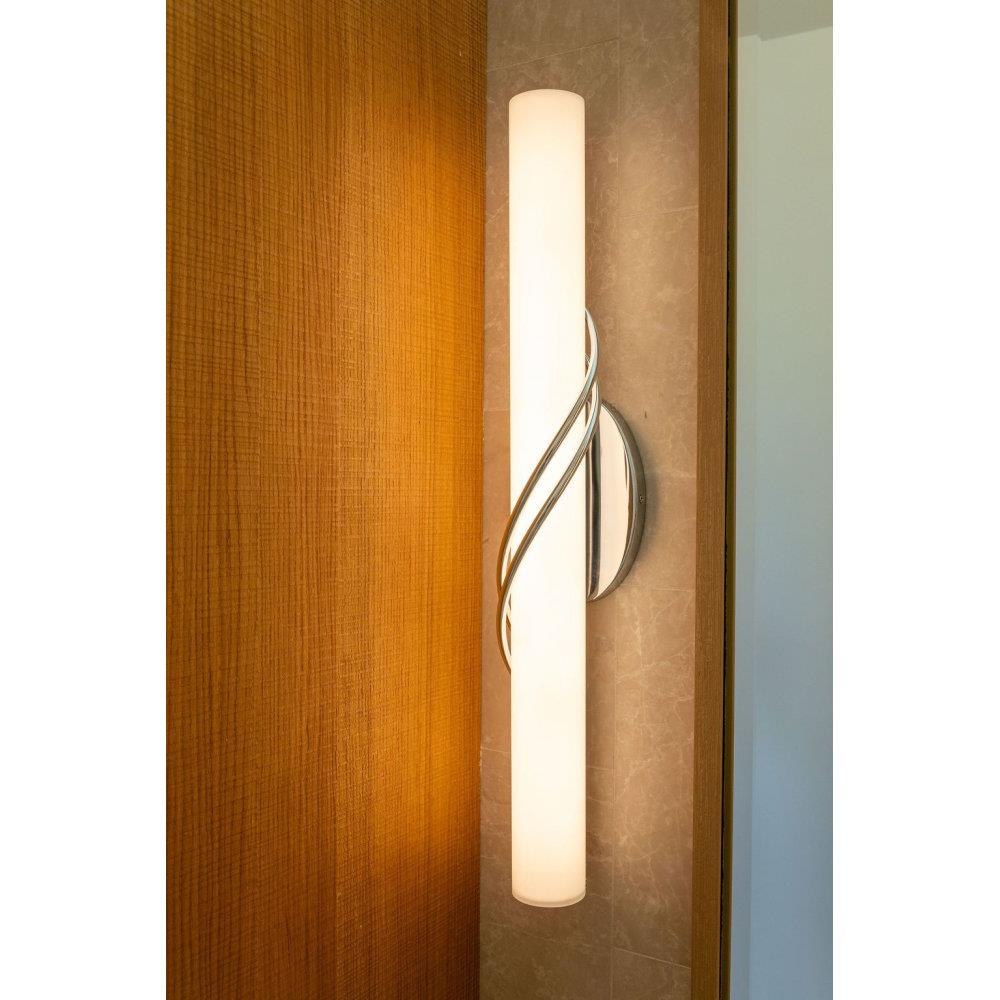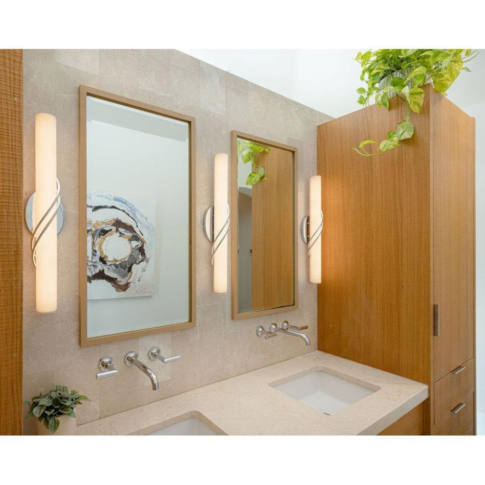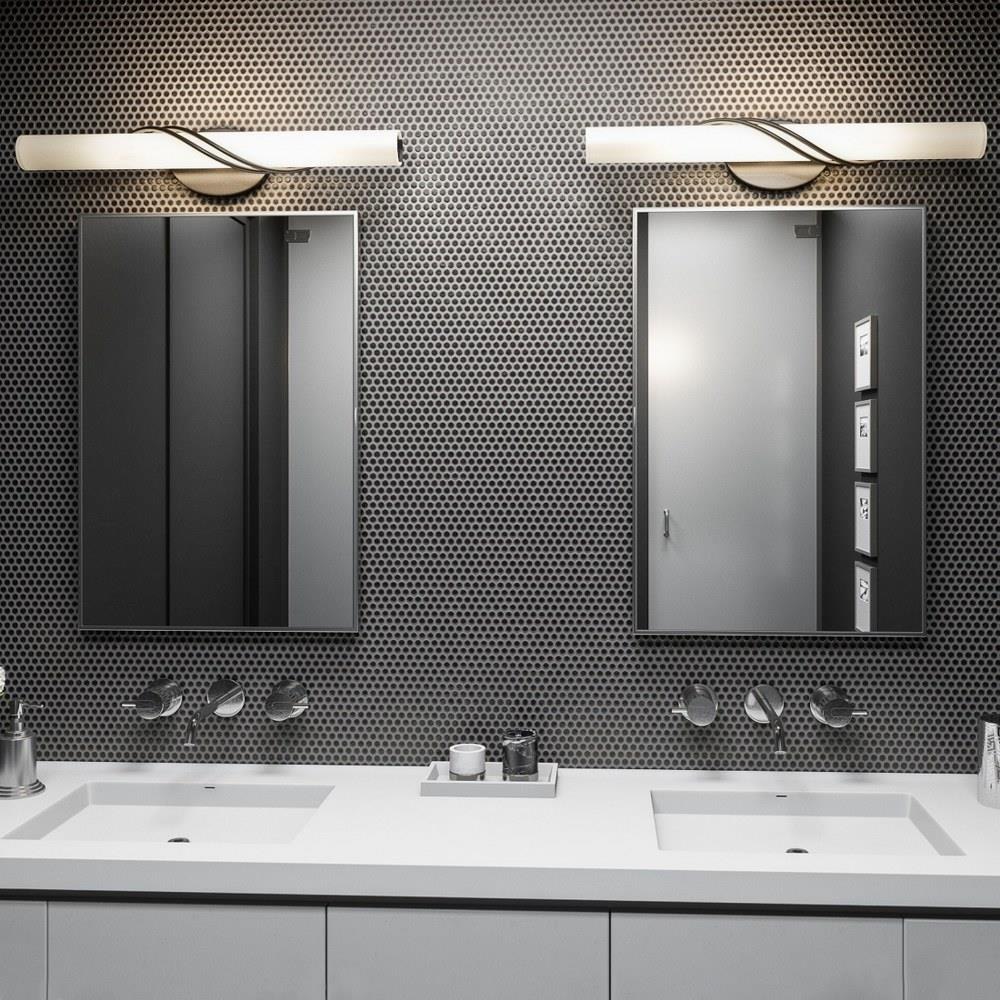 Simple meets sophisticated in the Serenade vanity light. This contemporary bath bar’s etched glass shade creates a soft, sleek appearance while evenly diffusing the integrated LED. Delicate accents in a lustrous Polished Chrome or Matte Black wrap the shade in added shine.Bathroom