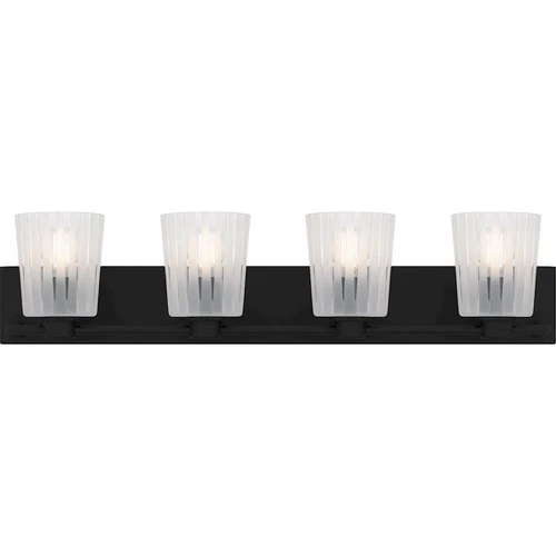 The clear glass shades are characterized by distinct vertical ribs that create an intriguing interplay of light and shadow. Etched patterns in between the ribs further the visual effect of the unique shades.