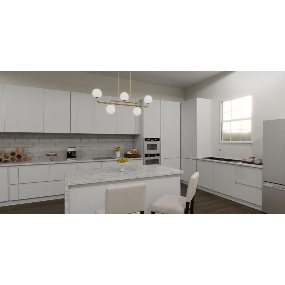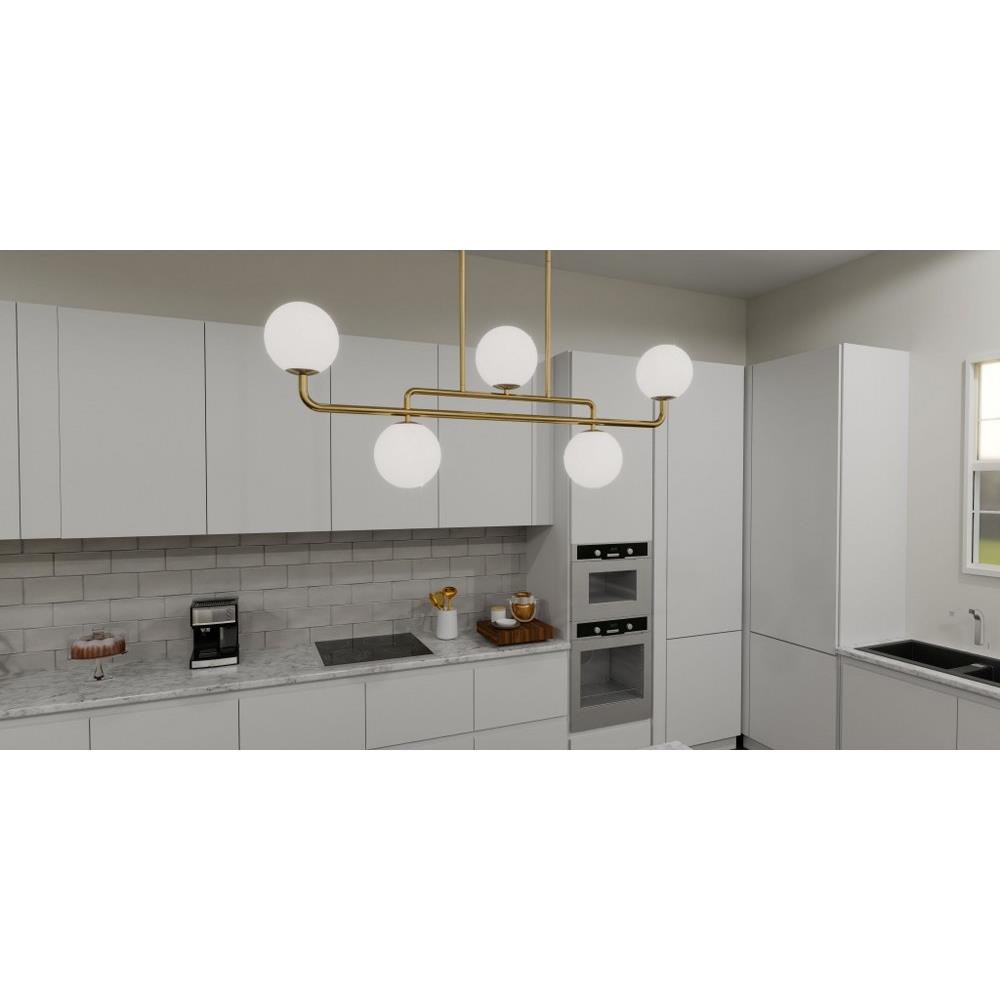 With a brushed gold finish and glass globes, the Regis island light makes a striking statement. The linear, geometric frame features opal etched swirled glass globes, facing both upwards and downwards for an intriguing lighting effect. Hang the Regis chandelier over any modern kitchen island, bar area, or dining room table for instant style.