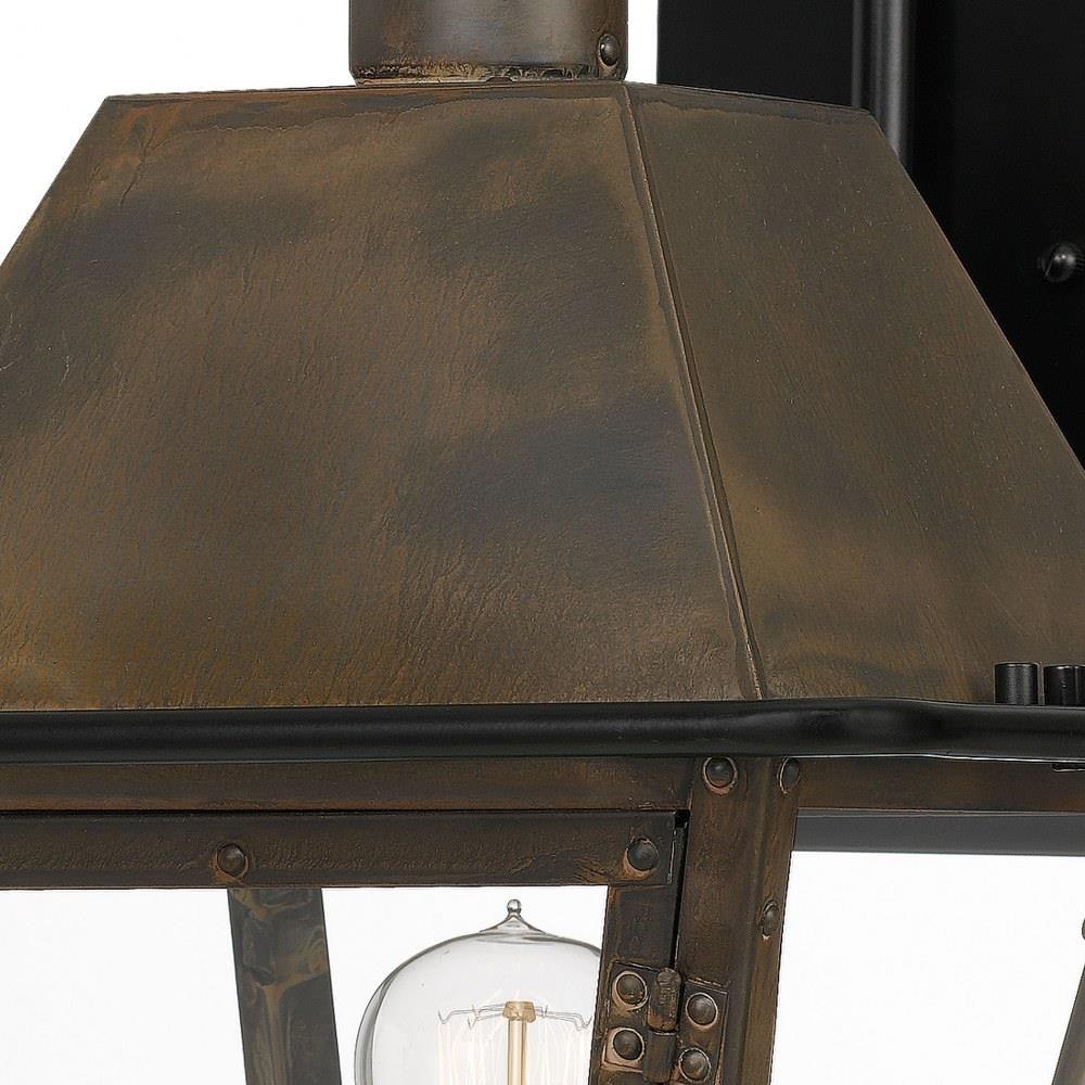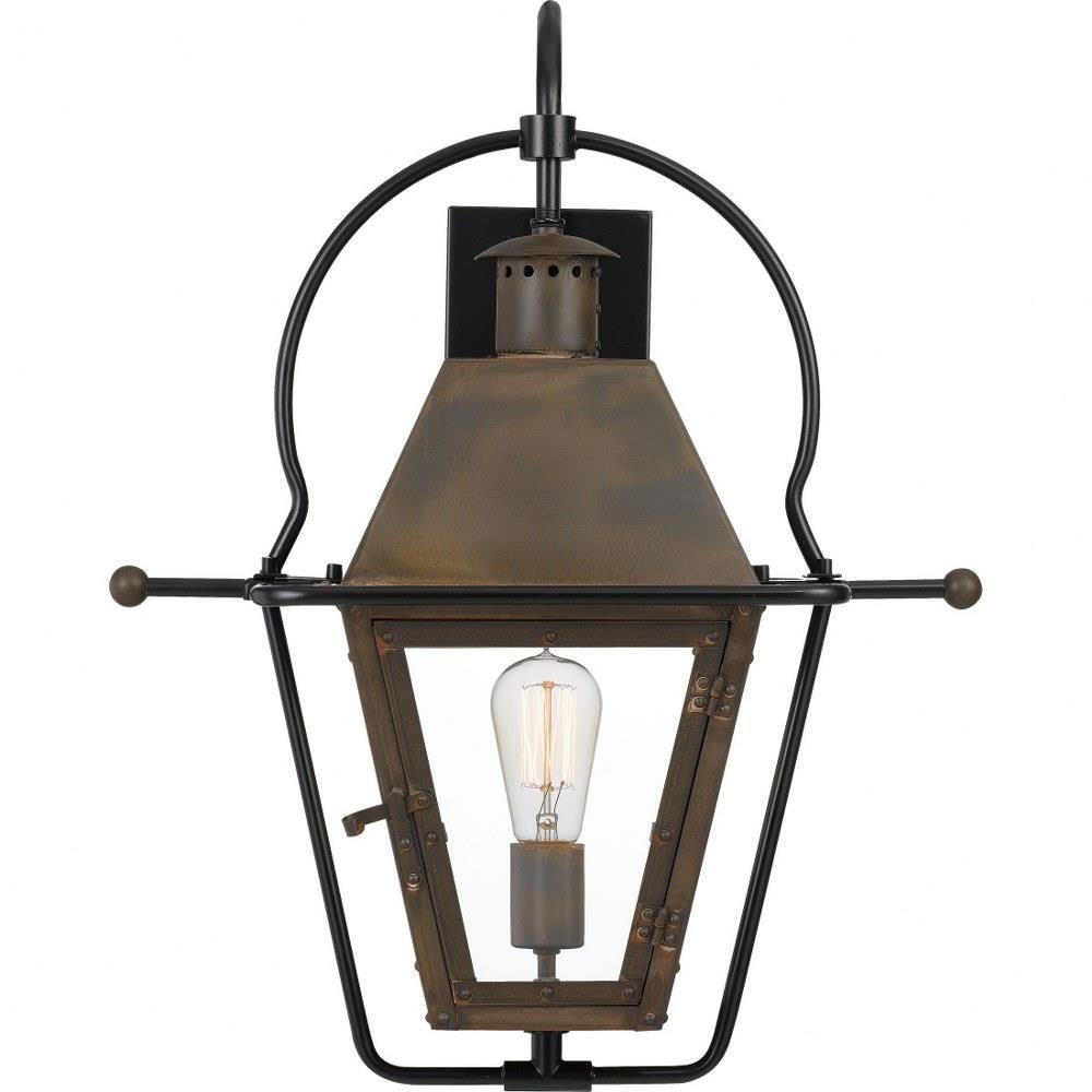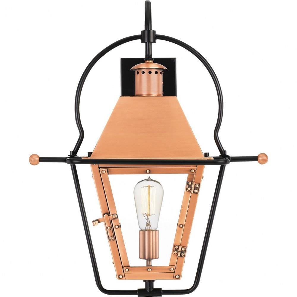 From the Charleston Copper & Brass Lantern Collection, the Rue De Royal offers the historic look of gas lighting without the hassle of a propane feed. It is all electric and features a hand-riveted solid copper or brass frame, combining the romantic charm of an antique lantern with the modern convenience of energy efficiency. 22.50" H 17.75" W 13.50" LBulb Type MED BASE A19Bulb Qty 1Base Finish AC - Aged Copper Item Weight 13.00BP Height In 9.00, BP Width In 4.50.
