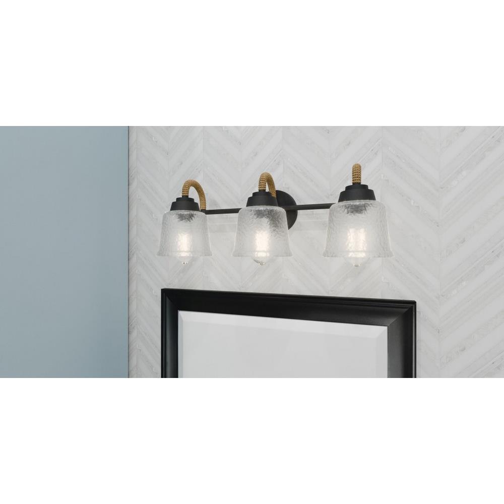 Upgrade any bathroom vanity with the addition of Seabreeze. This coastal-inspired bath light collection features clear hammered glass shades and a matte black finish. A natural looking arm takes the place of traditional metal, adding a nautical feel. Install Seabreeze with shades facing upwards or downwards, whichever best suits your unique space.