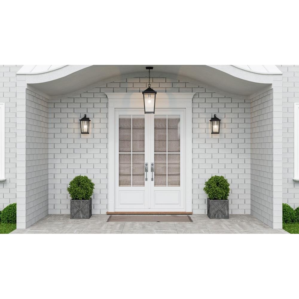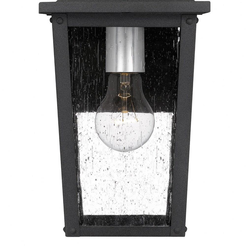 Clear seeded glass gives Stoneleigh a touch of whimsy. In a mottled black finish, This pendant design is otherwise stately and handsome. Suspend it within a portico to welcome guests in refined fashion.