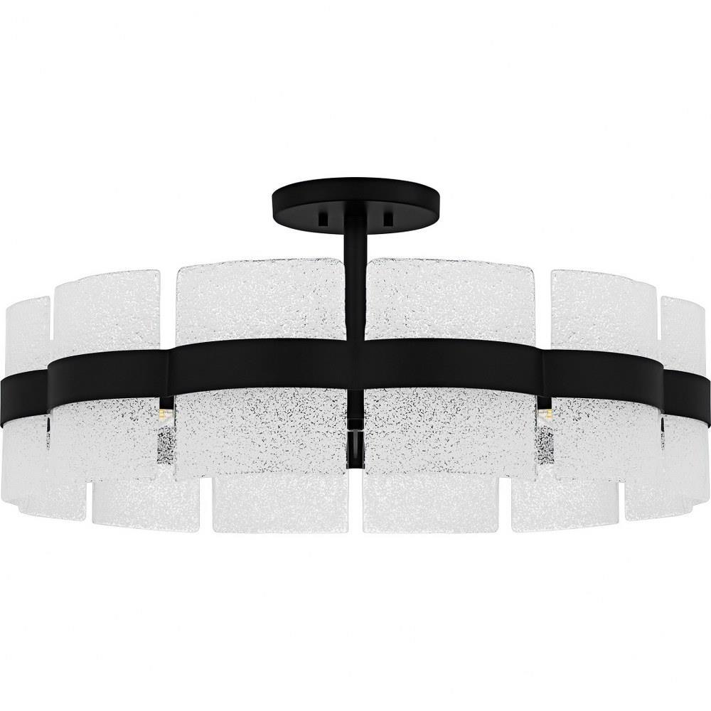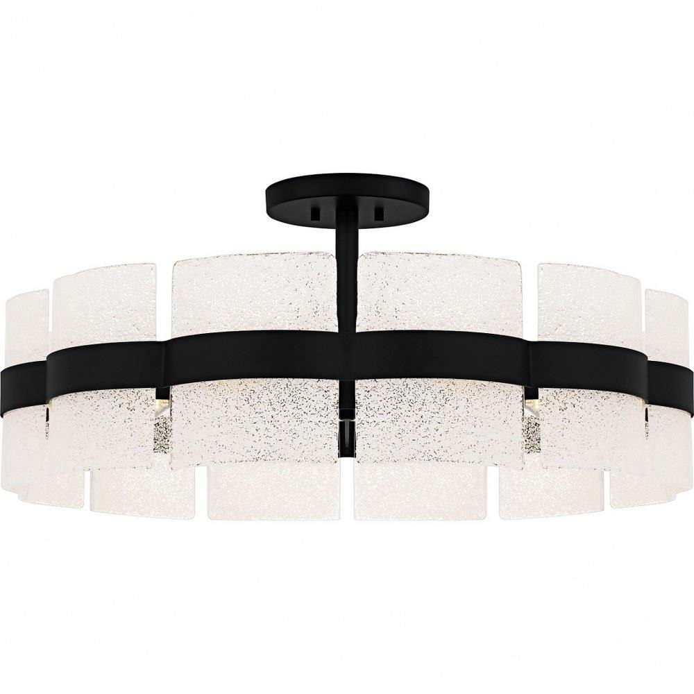 • Matte black finish pairs with unique white sand glass shades for a modern look