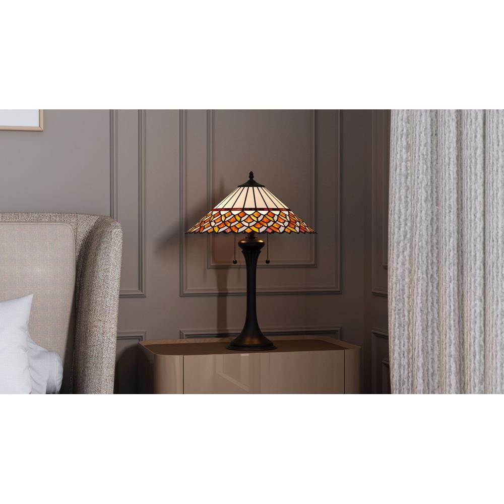 Illuminate your space with the Isla table lamp, a beautiful blend of classic Tiffany style and transitional design. Featuring intricate handcrafted glass in a timeless pattern, this lamp adds a touch of elegance and sophistication to any room. The matte black finish on the base contrasts beautifully with the colorful glass, creating a timeless look perfect for adding a sophisticated accent to your living room, study, or bedroom.