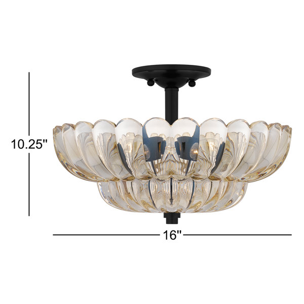 Featuring a beautifully scalloped shade, the Whitecap semi-flush mount light is elegant and sophisticated. The amber glass flows beautifully upward towards the canopy. Whitecap is finished in a rich mottled cocoa finish, providing depth and contrast to the shimmering glass. Hang this beautiful ceiling light in any hallway, foyer, home office, bathroom, or kitchen for instant style.