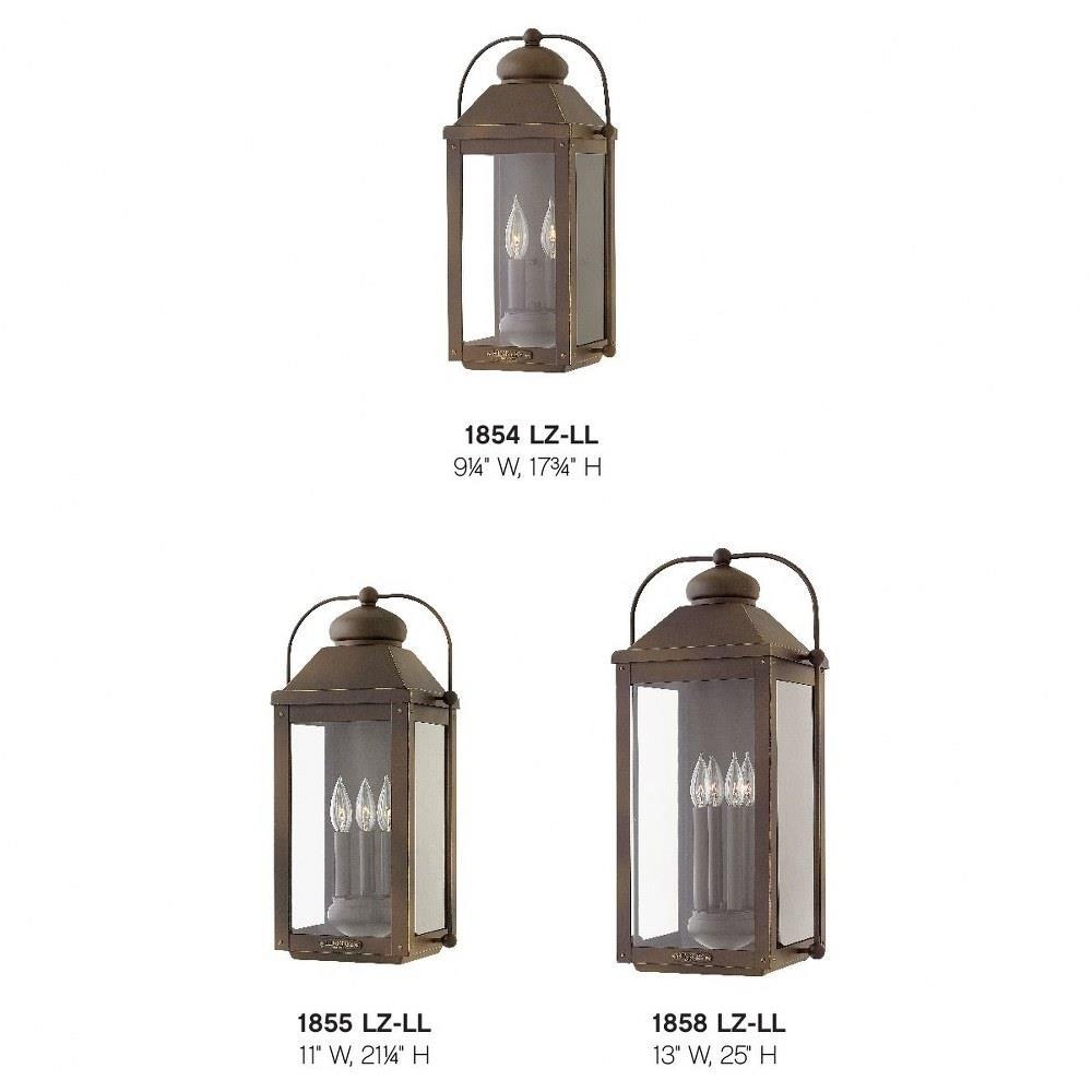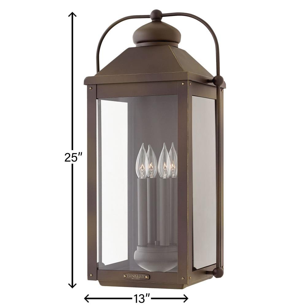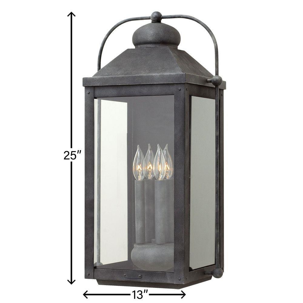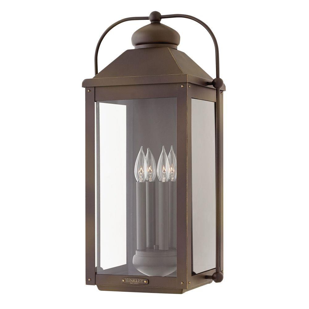 Anchorage is an early American lantern design crafted of solid aluminum to reflect a bold yet refined silhouette. The Aged Zinc or Light Oiled Bronze finish and clear glass complement the long clean lines, elegant arched carriage handle and sturdy knobs, resulting in a vintage style with classic charisma.Our Estate Collections boast a breadth of fixtures defined by coordinating composition, enduring architecture, and time-honored craftsmanship, designed to meet the needs of expansive properties with extended outdoor living spaces. From the entrance of your driveway to the depths of your backyard, these collections provide cohesive design for stately exteriors. / Suitable for use in wet (outdoor direct rain or sprinkler) locations as defined by NEC and CEC. Meets United States UL Underwriters Laboratories & CSA Canadian Standards Association Product Safety Standards / Classic lines and heritage details complement traditional architecture / 2 year finish warranty / The Heritage Collection encompasses premium outdoor fixtures that pay tribute to the nostalgia of America's past while reinforcing Hinkley's philosophy of timeless, quality design. / Warm rich light bronze tone