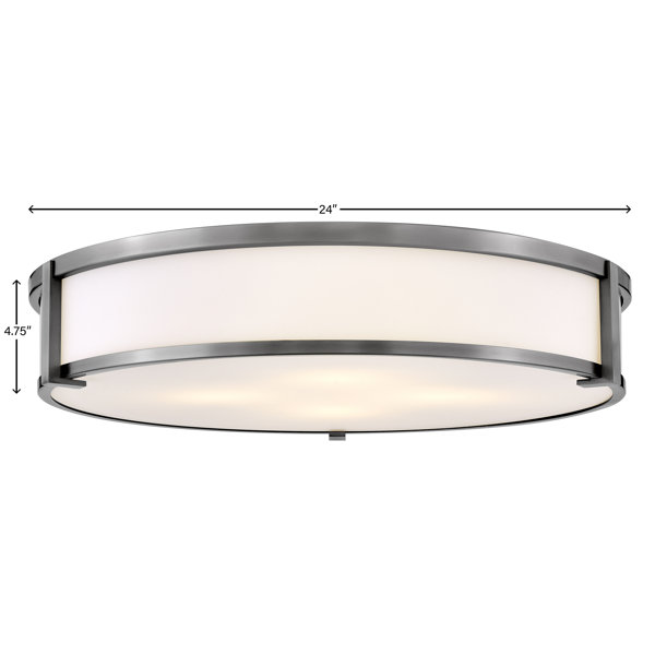 A bold, Large Flush Mount Ceiling Light that elevates lighting in areas with low ceilings, or as the main source when layering lighting in a space. Available in four classic finishes, the Transitional design features subtle, Mid-Century Modern overtones. A Twist-Lock system secures the fixture to the canopy above, while the Etched Opal Glass rests within the framing, featuring robust cast L-brackets. Illuminated by (4) 7w Medium LED bulbs (not included) creating a lot of light.
