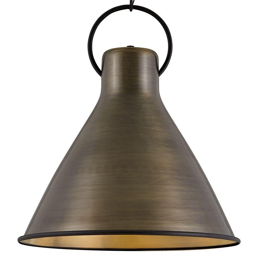The profile is simple, hardworking and meant to reflect the farmhouse style it complements so well. A metal shade in a variety of finishes, featuring a bottom ring and an oversized loop in Distressed Black. Wiring is threaded through the loop instead of being exposed, which ensures the look remains clean, casual and tasteful.Suitable for use in dry (indoor) locations as defined by NEC and CEC. Meets United States UL Underwriters Laboratories & CSA Canadian Standards Association Product Safety Standards / This chain or cable hung fixture may be installed on any sloped ceiling / Classic, elegant lines and timeless details enhance a traditional space / Rich dark brass finish