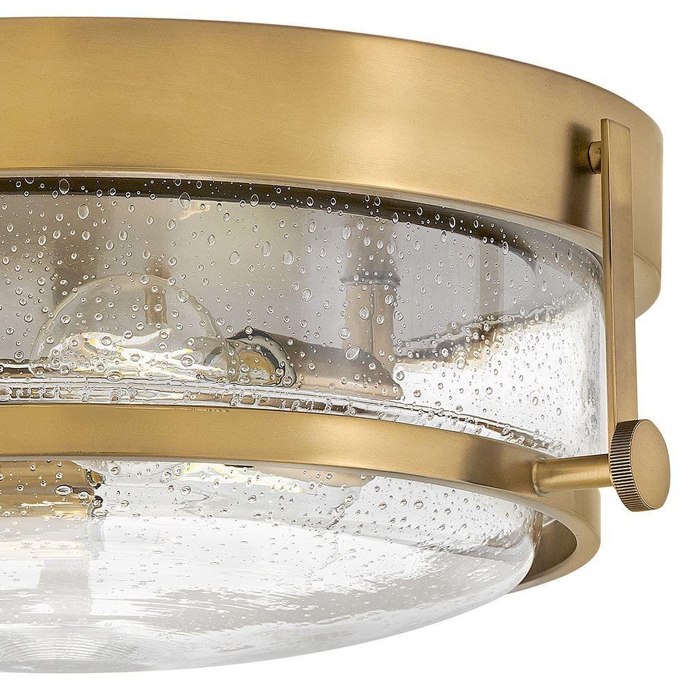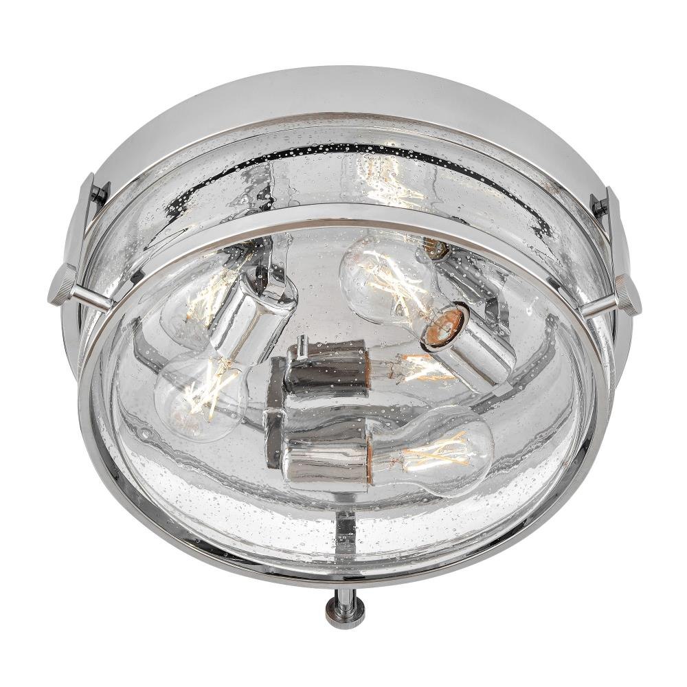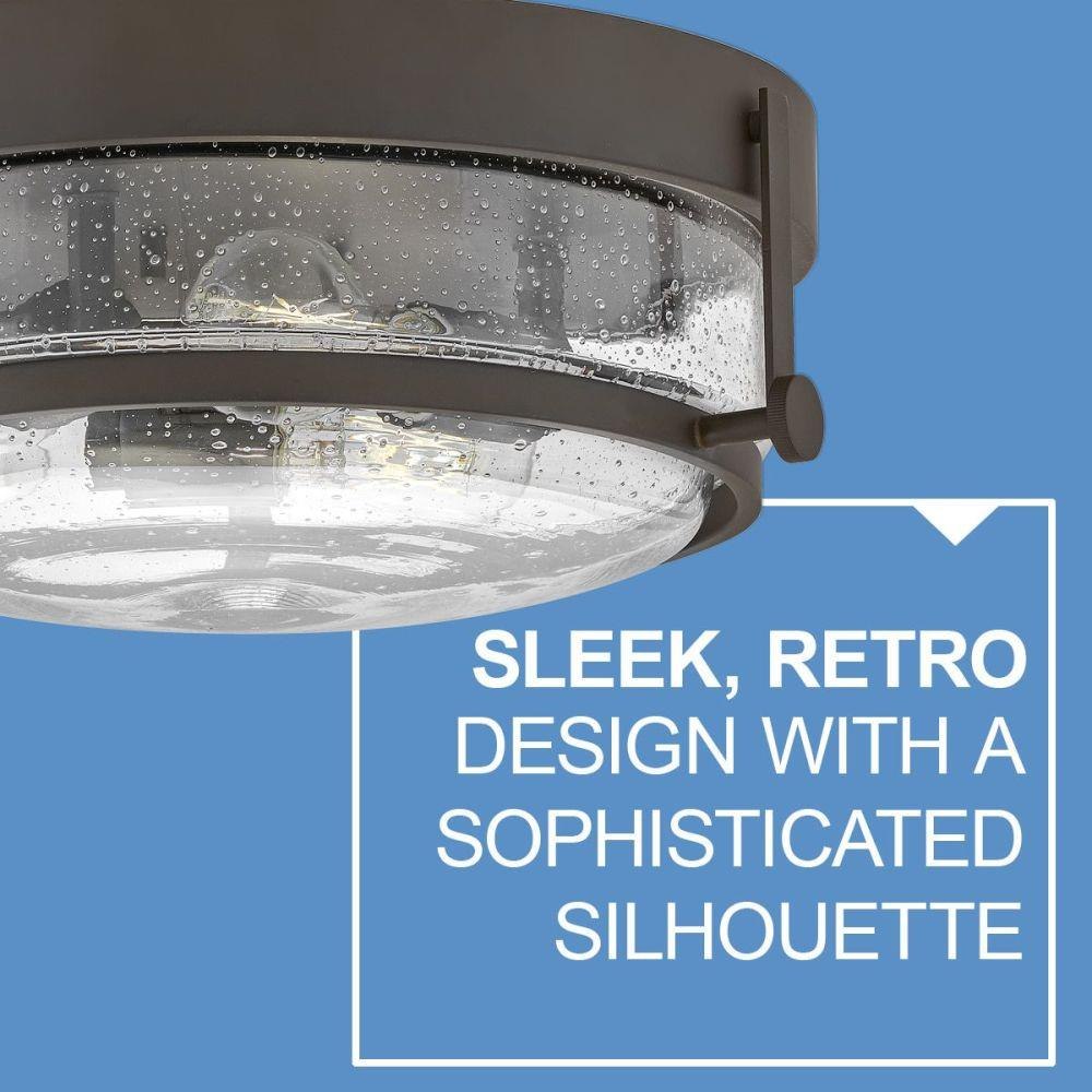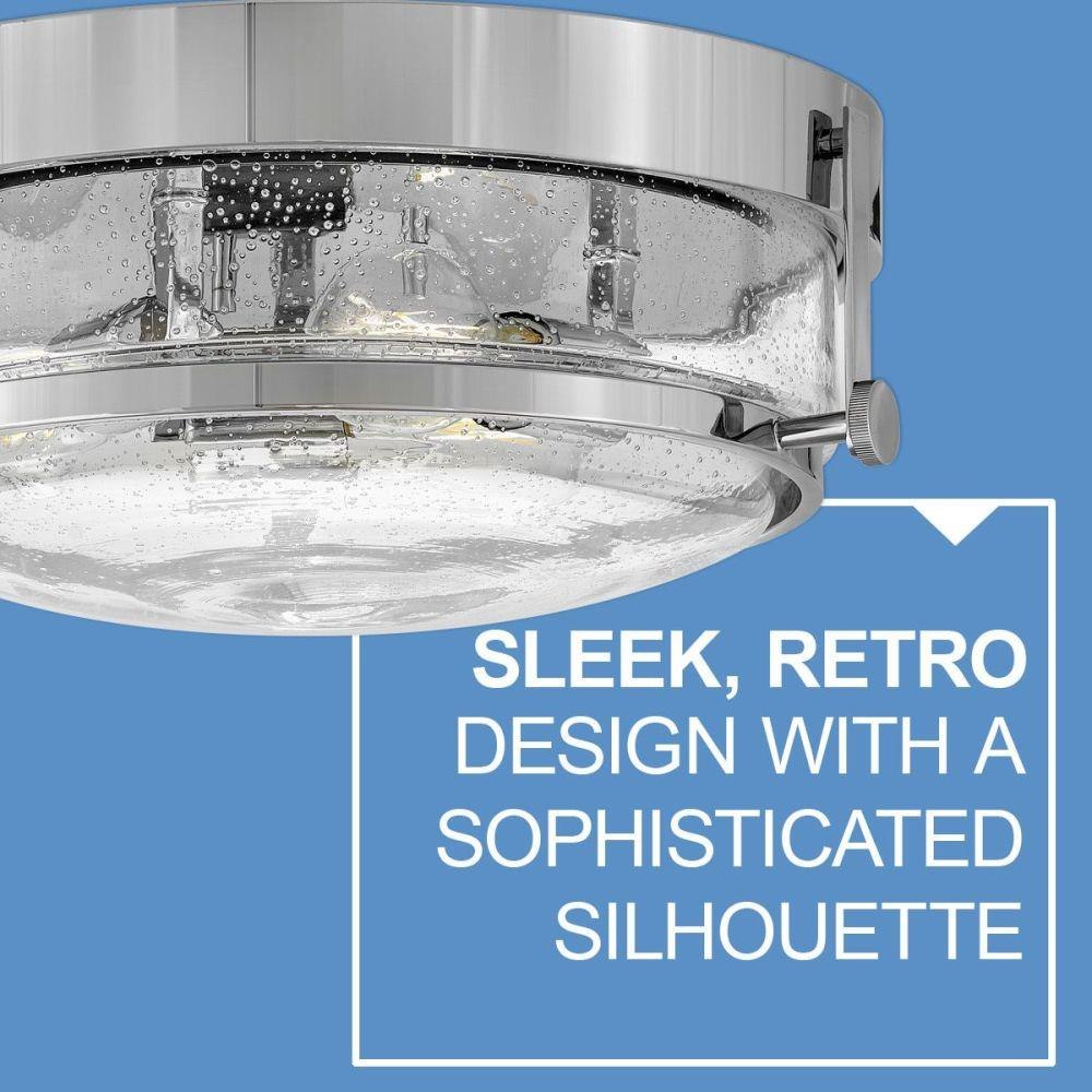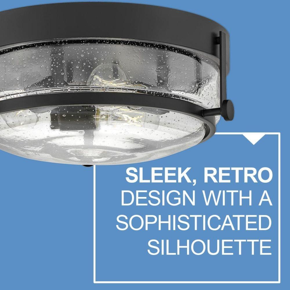 Harper’s sleek, retro design elevates the traditional ceiling mount with a unique clear seedy glass bound by a prominent metal ring and decorative knobs. Available in five classic finishes.